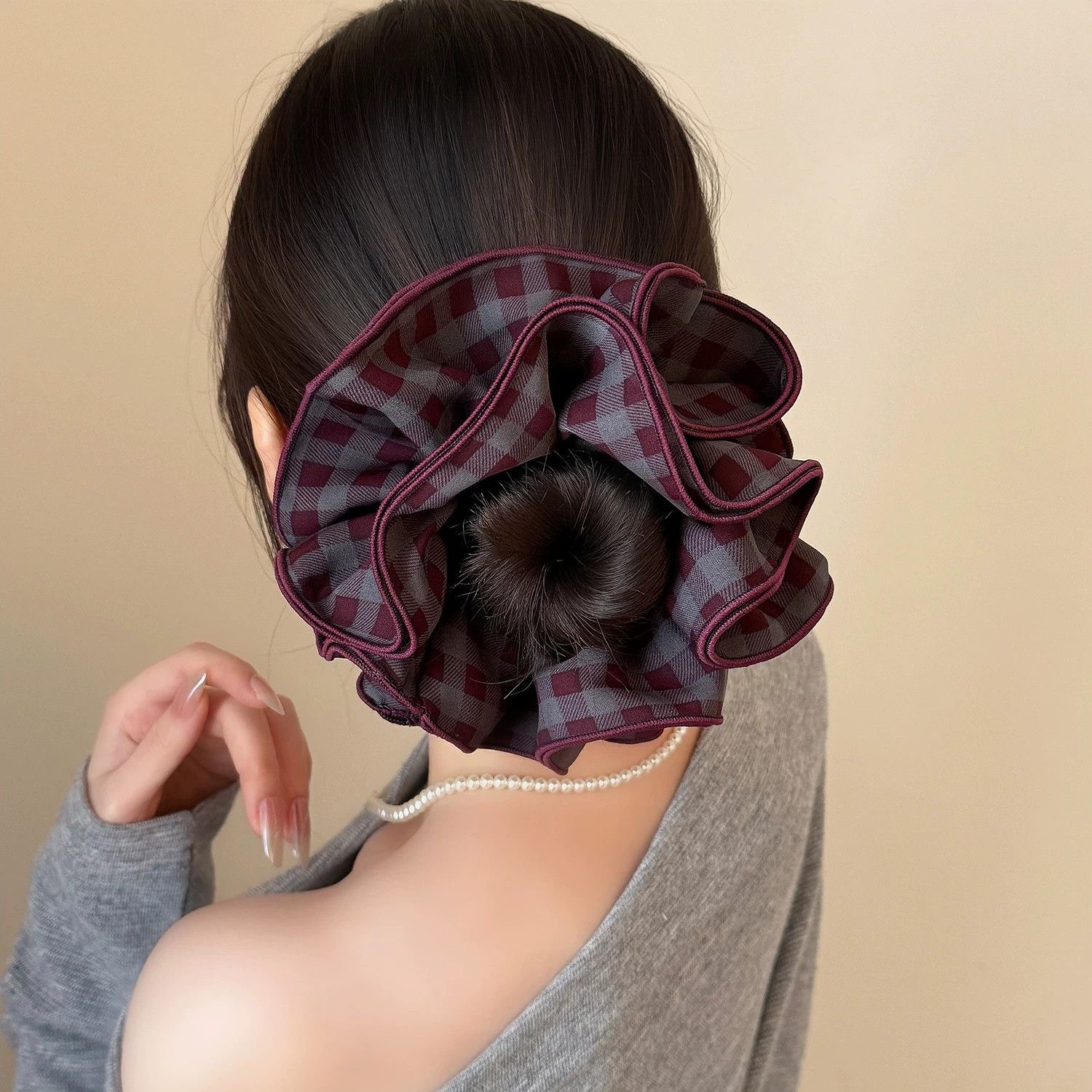 53# Grey checkered cotton-padded bow hair band, about 15cm