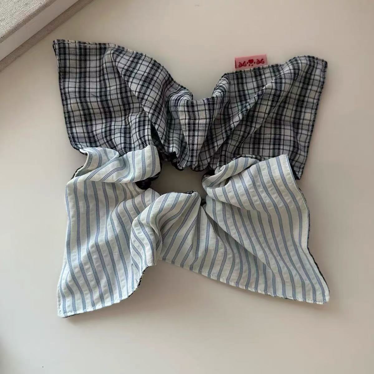 38# Square Scarf style - Blue checkered striped patchwork tape label approximately 22cm