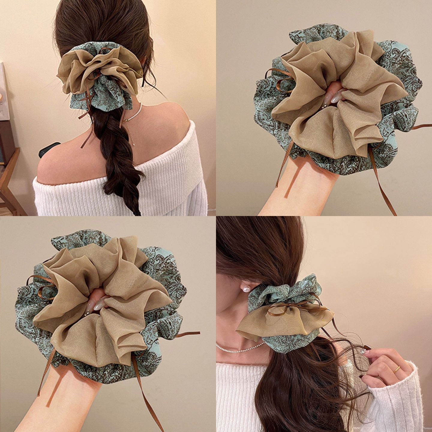 43# Beige satin milk silk beaded hair tie, about 25cm