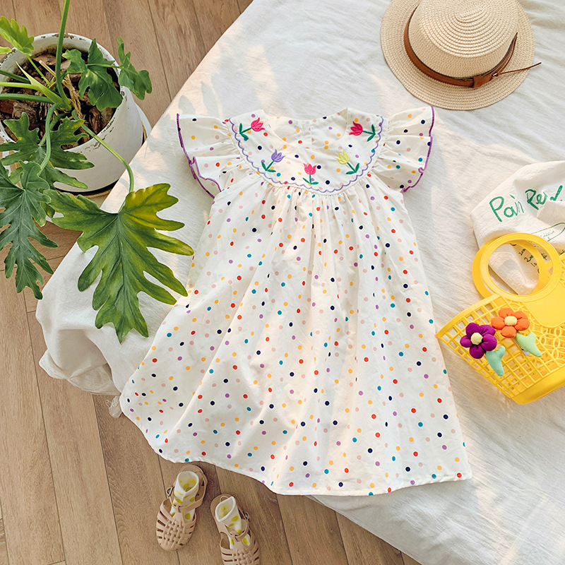 Korean children's clothing colorful polka dot tulip embroidery girls' dress 2023 Summer style Flying sleeve sweet princess dress