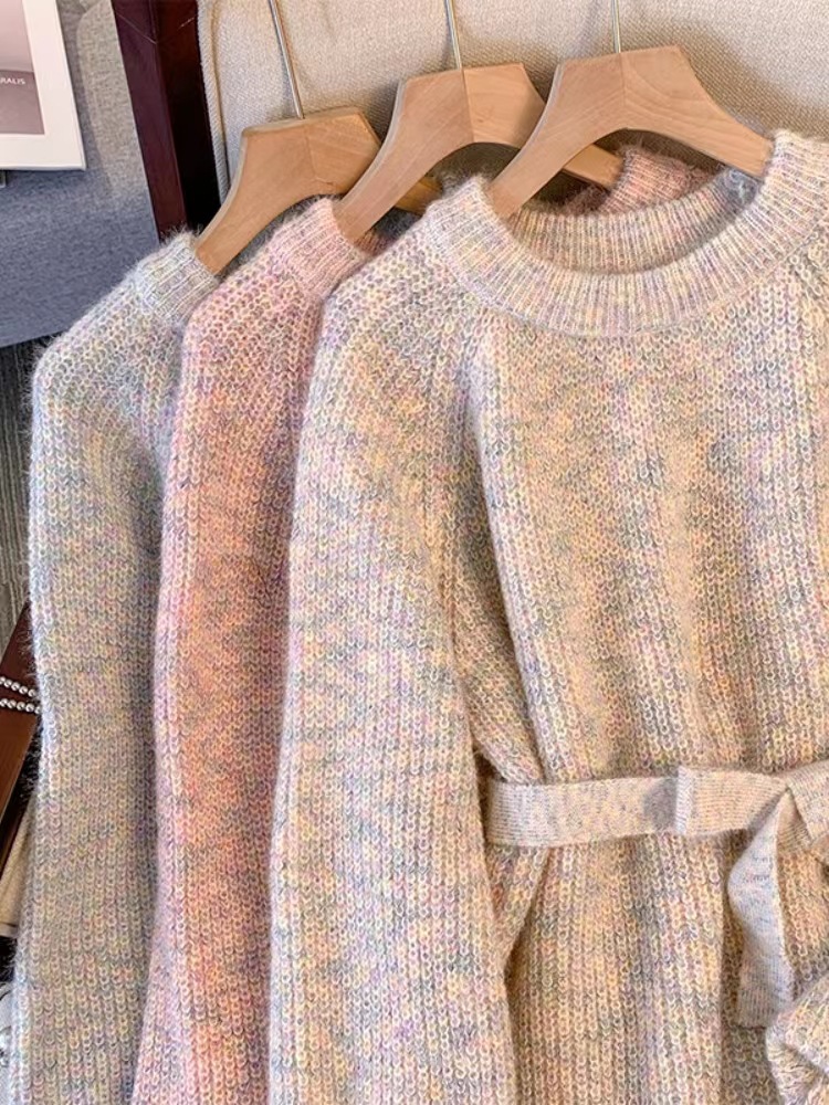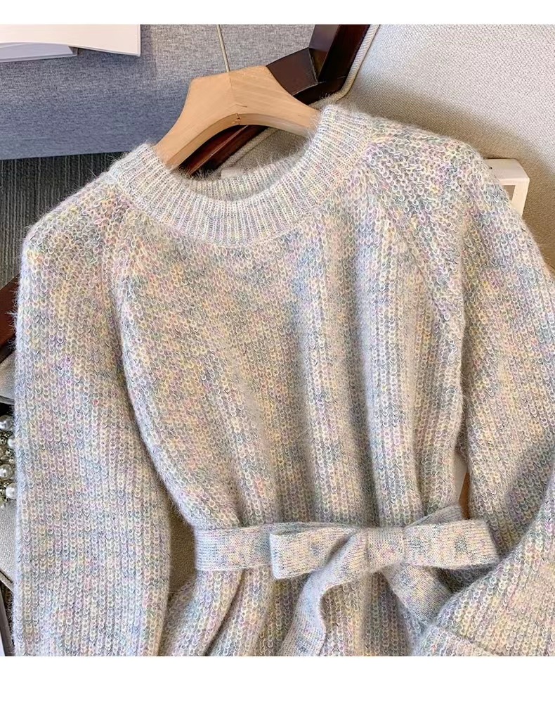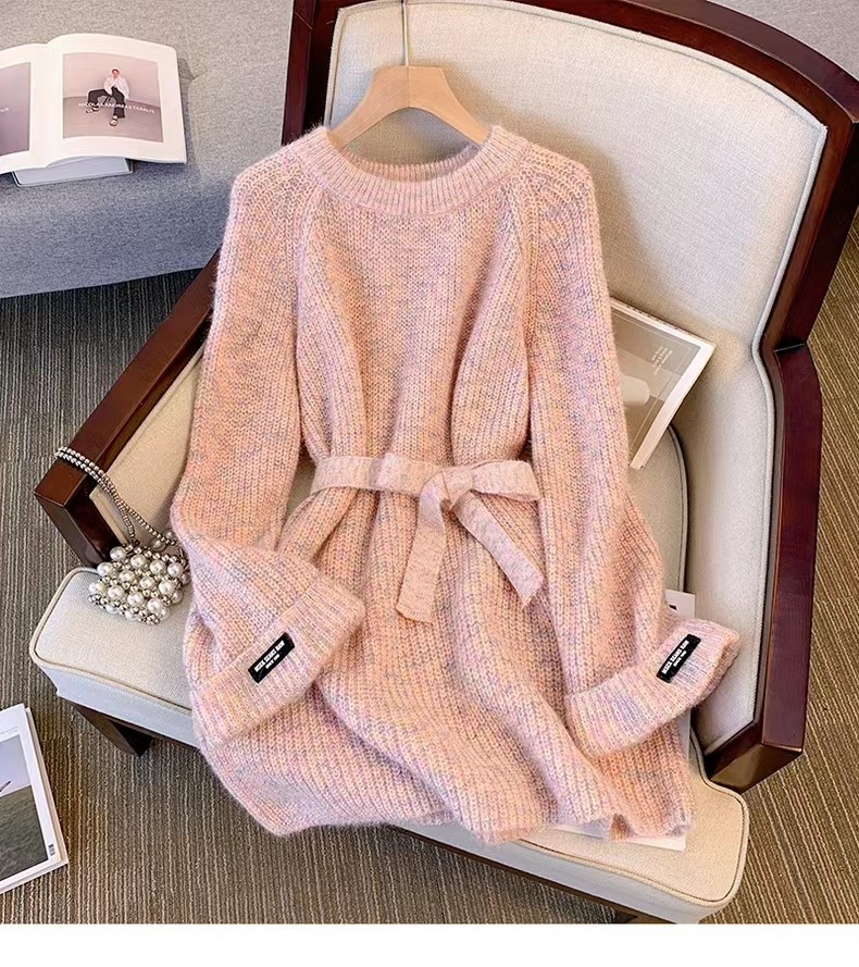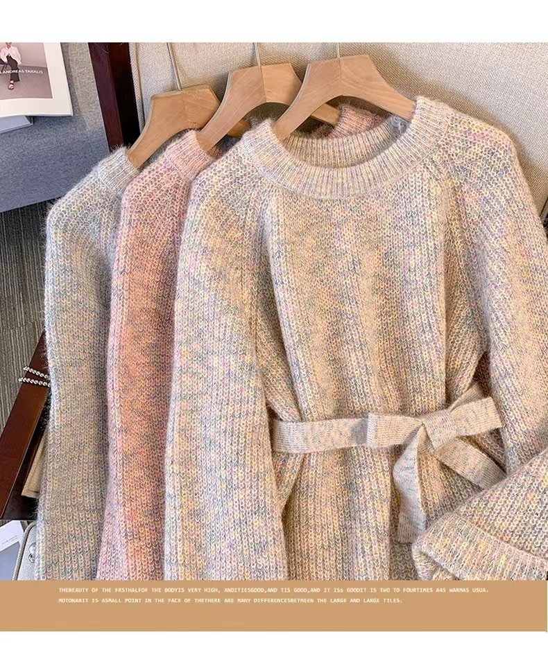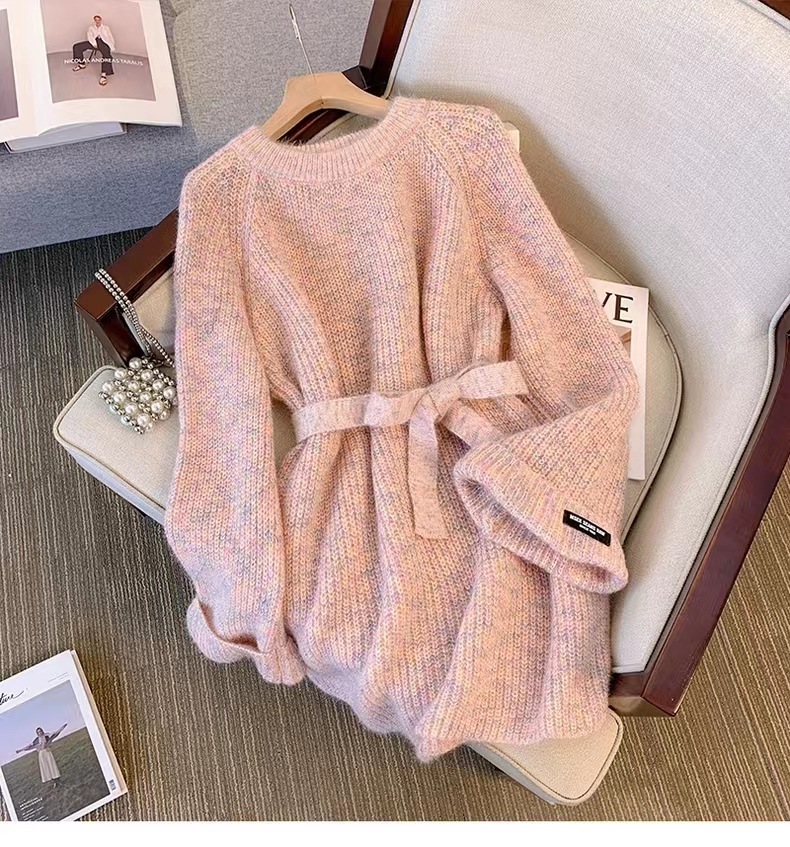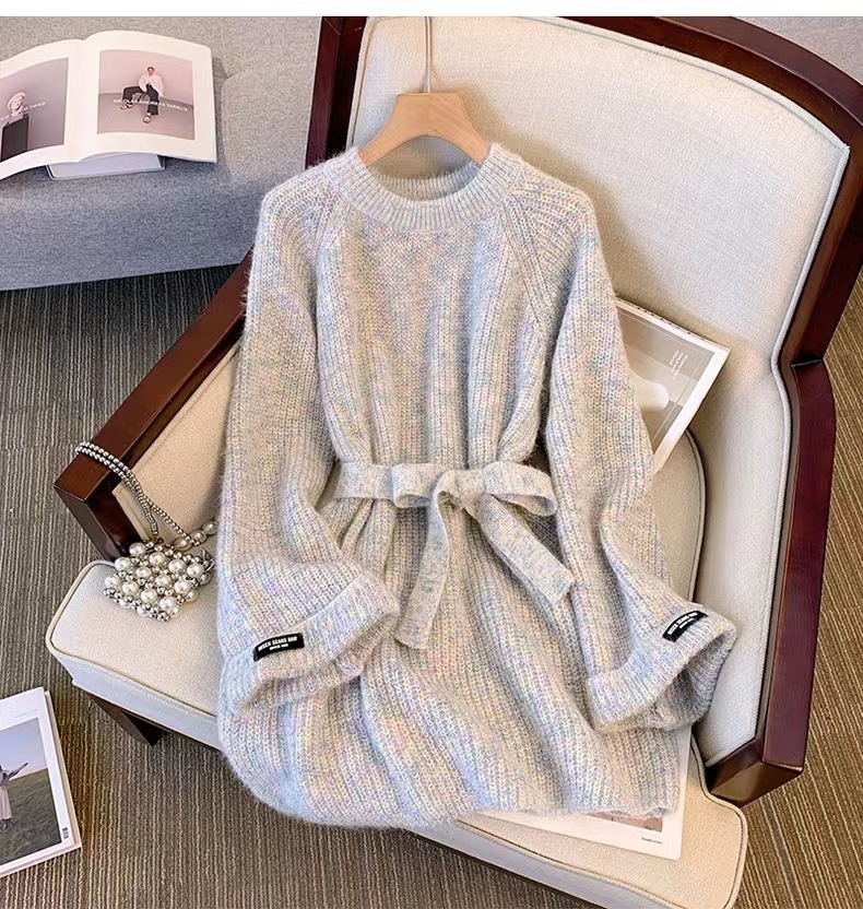 Korean large-sized round-neck knitted sweater for autumn women's wear, laid-back style, slightly plump girls look slimmer, mid-length waist-cinching pullover sweater