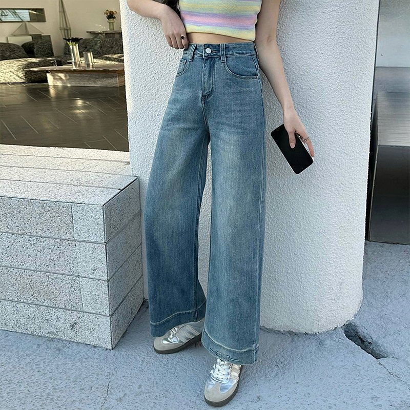 Korean stretch high-waisted 9-inch jeans for women, Spring 2025 new style straight-leg loose wide-leg pants, casual grandma pants