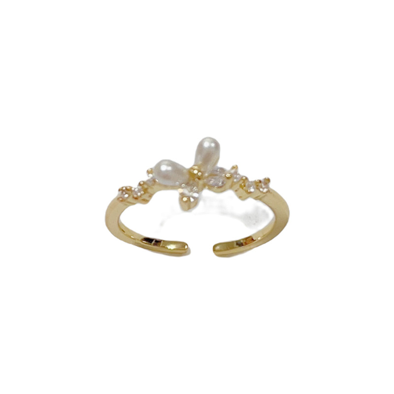 Korean-style, fashionable, sweet and versatile diamond-encrusted pearl butterfly opening ring, personalized and light luxury design index finger ring wholesale