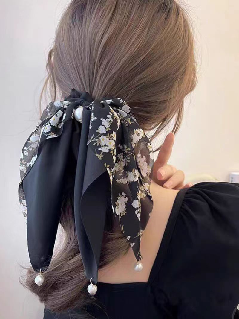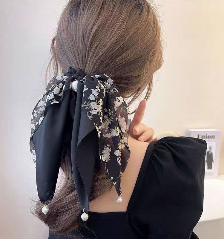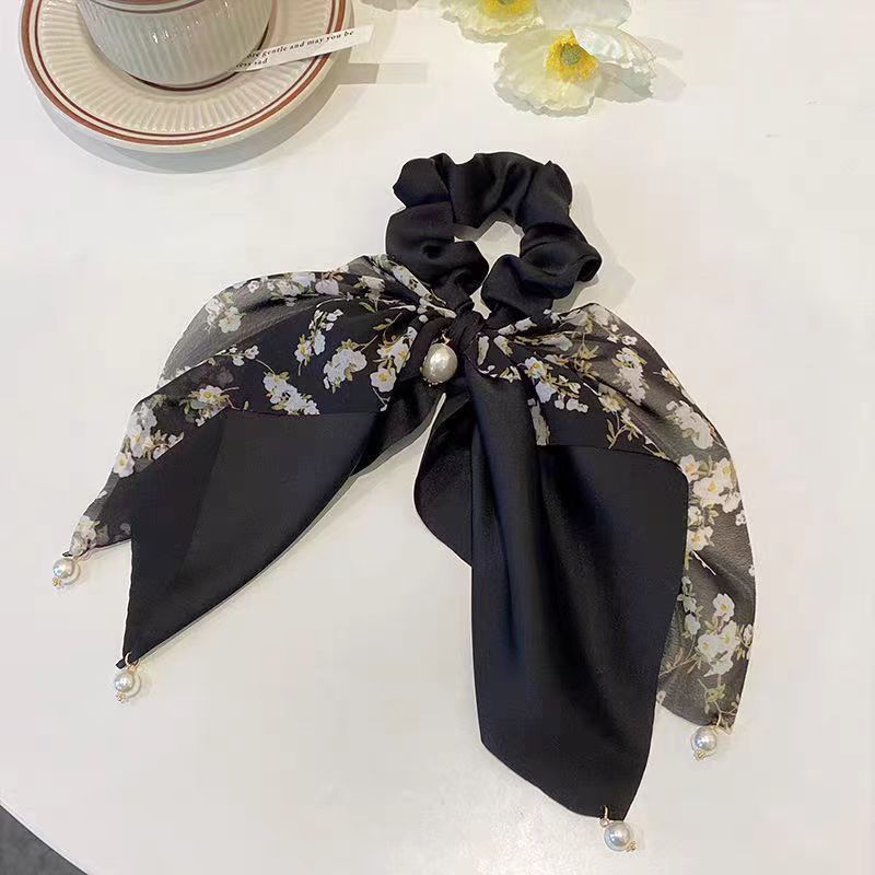 Korean-style fresh and delicate floral satin bow hair tie, women's ponytail ribbon, pearl pendant, large intestine hair band