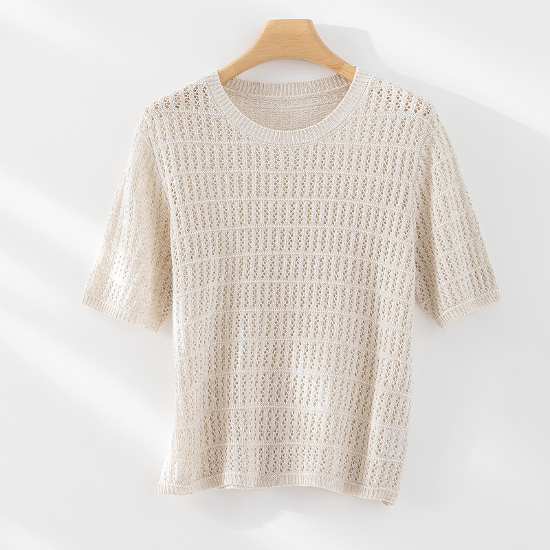 Korean style simple hollowed-out knitted short-sleeved T-shirt for women's summer new design sense, casual and versatile, round-neck solid color top