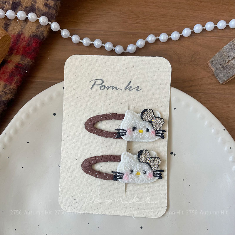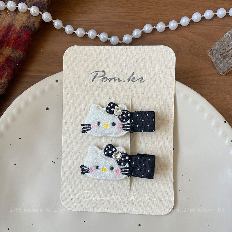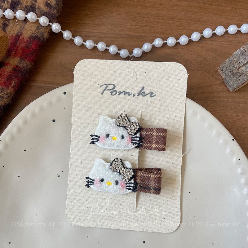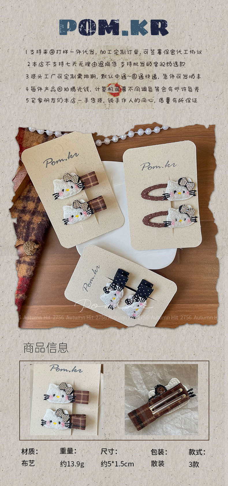 Korean version new cartoon KT children's hair clip, cute cat girl, sweet bangs, side clip, checkered embroidery, handcrafted Pom.kr knitted hair clip: checkered polka dot butterfly autumn and winter sweet girl, cute style headwear, matching hair accessory