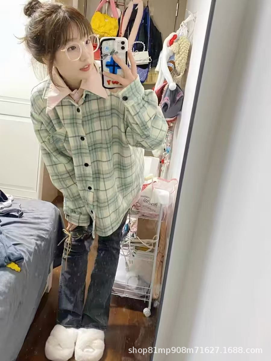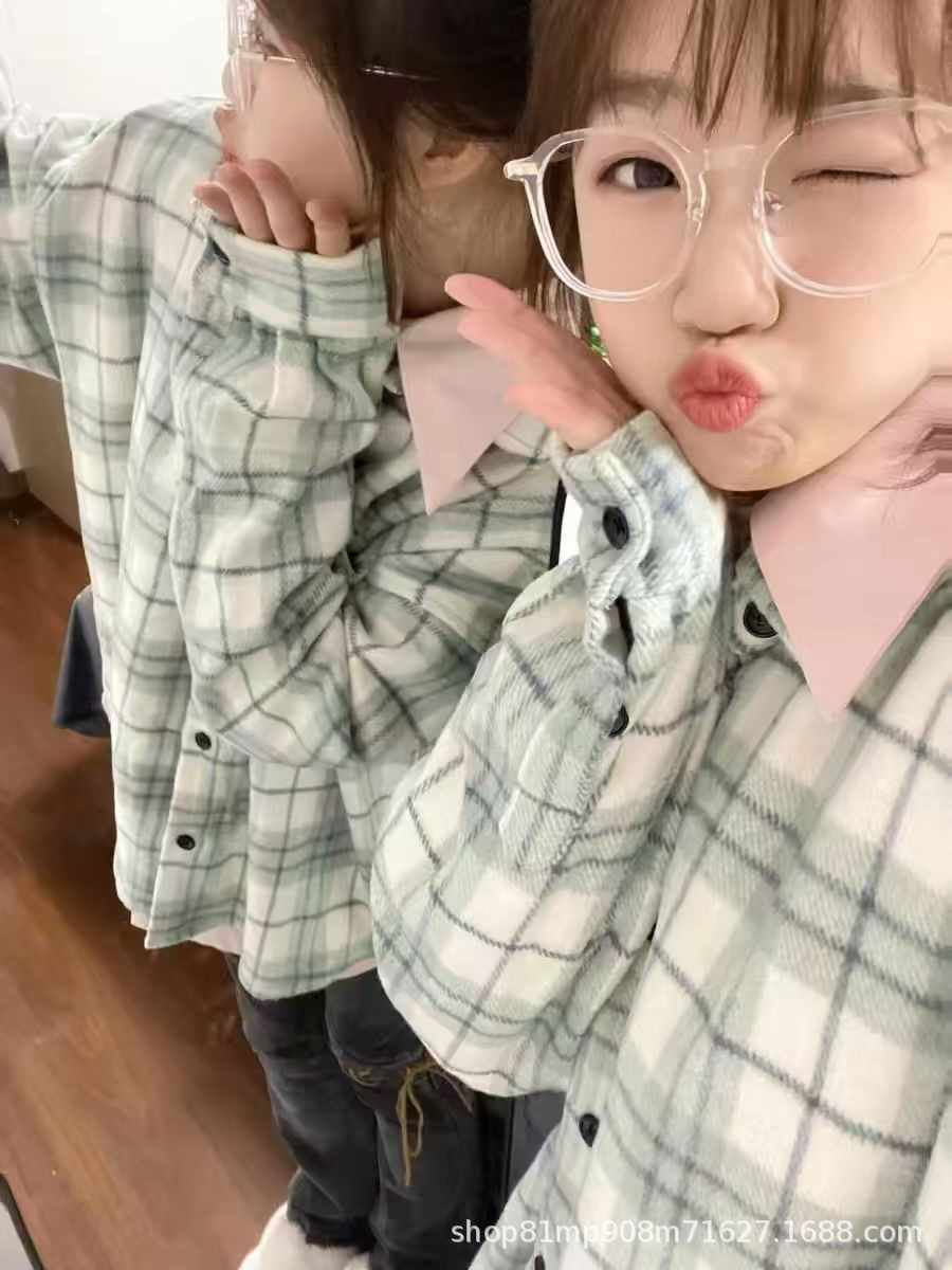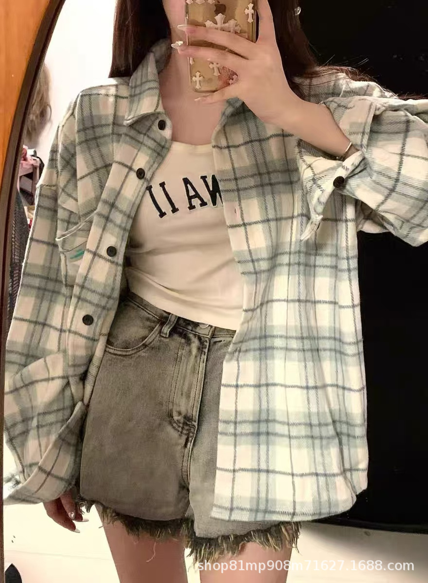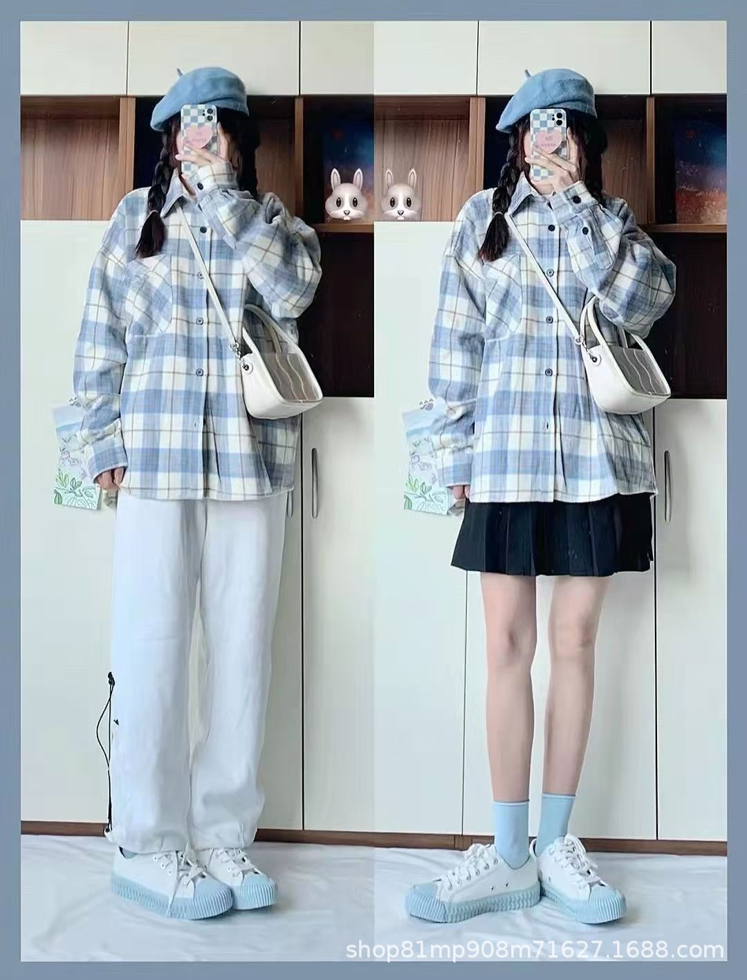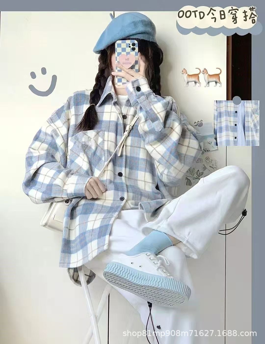 La Chapelle light blue checkered long-sleeved shirt for women's Spring and Autumn 2025 new style college style loose casual jacket top