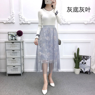 Lace chiffon skirt mid-length flower embroidery 2019 Spring and Autumn new Korean-style pleated mesh fairy long dress