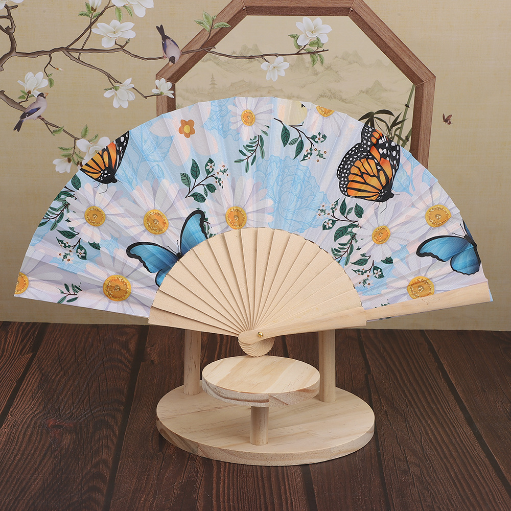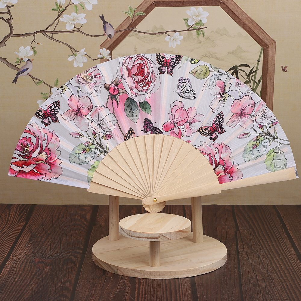Ladies' ancient-style folding fan, red fabric fan, original color bone flower gift promotion fan, small and exquisite summer fan
