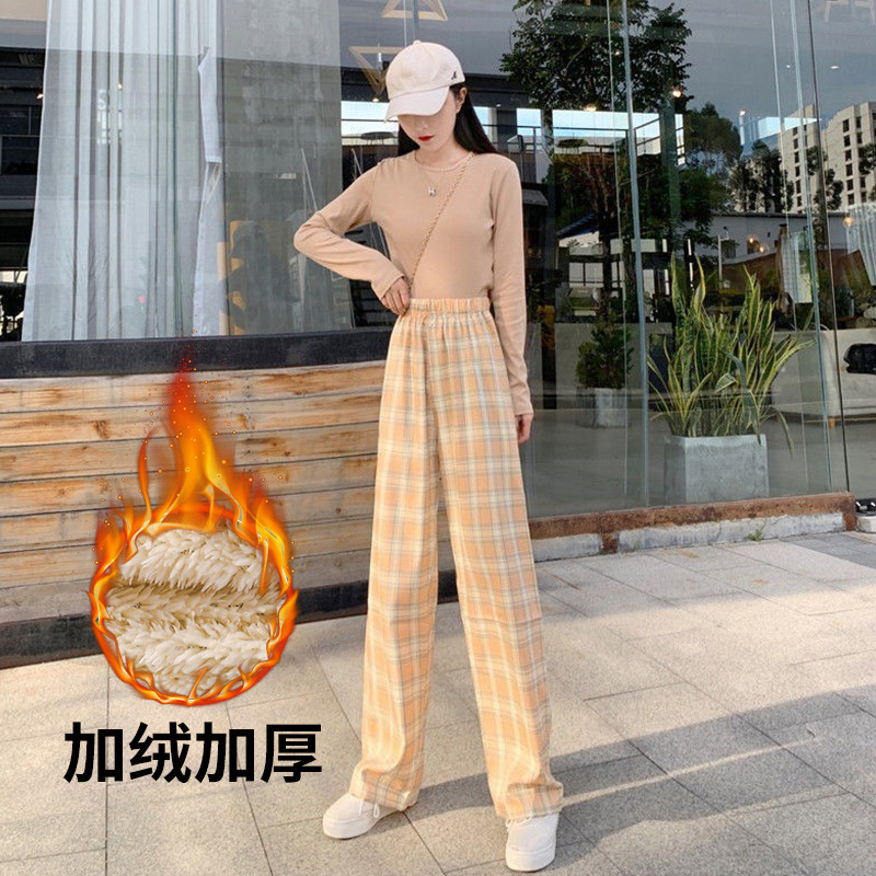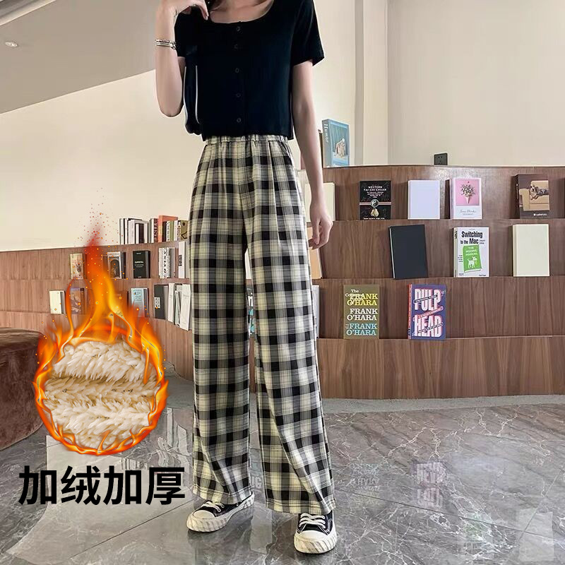 Lamb fleece checkered pants Women's 2021 autumn/winter new high-waisted, slimming, draping, straight-leg casual wide-leg floor-length women's trousers