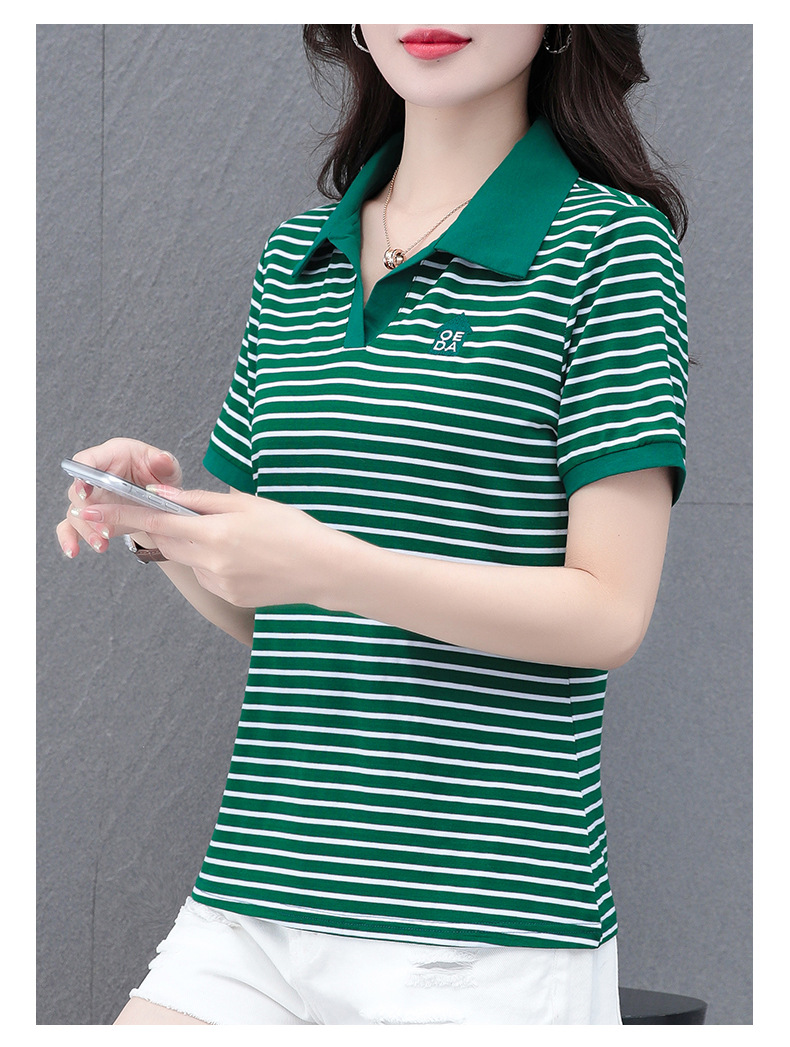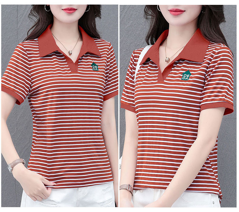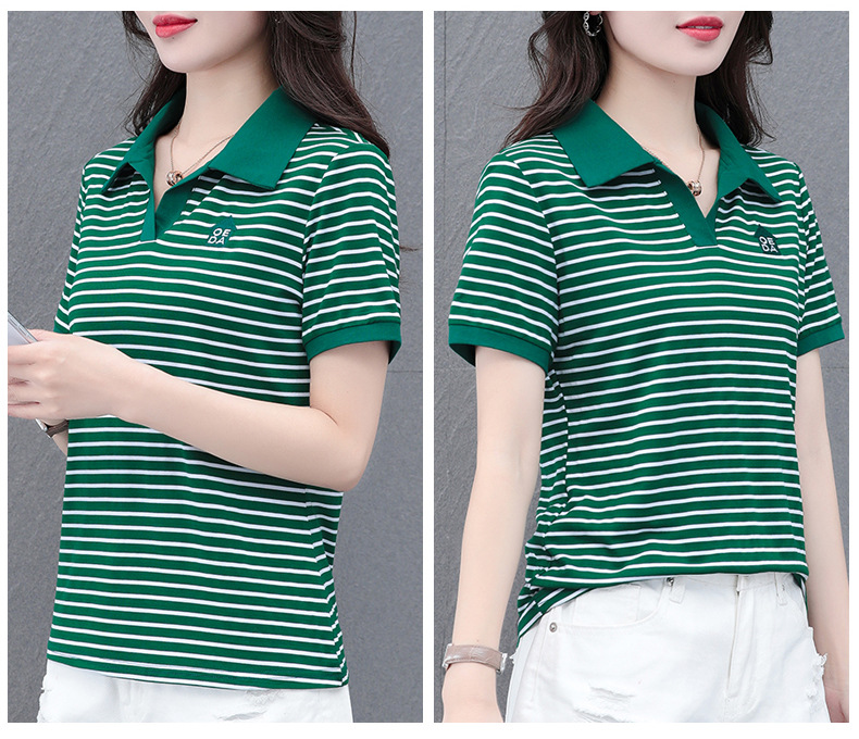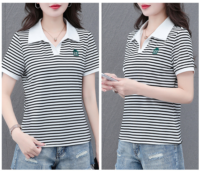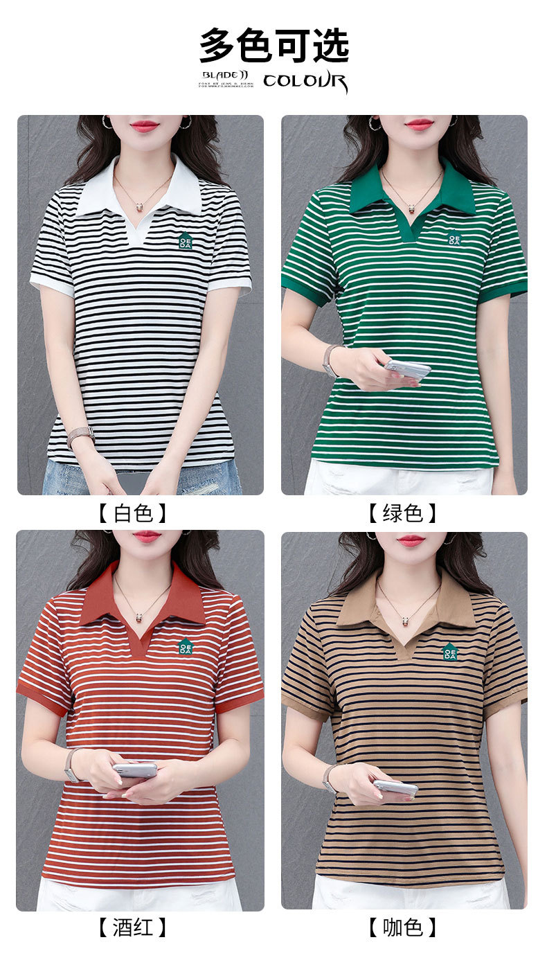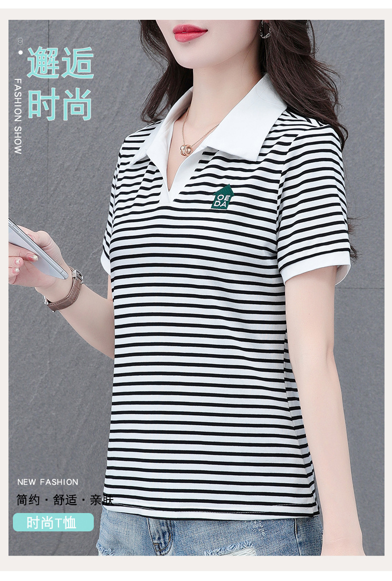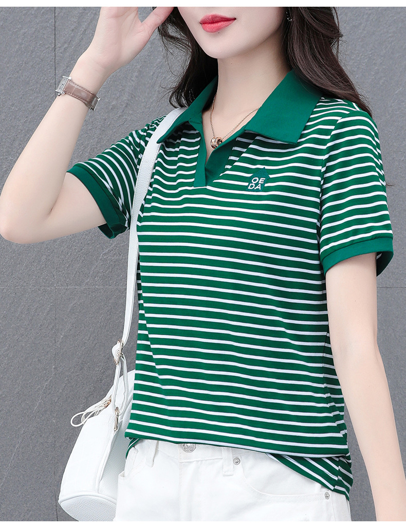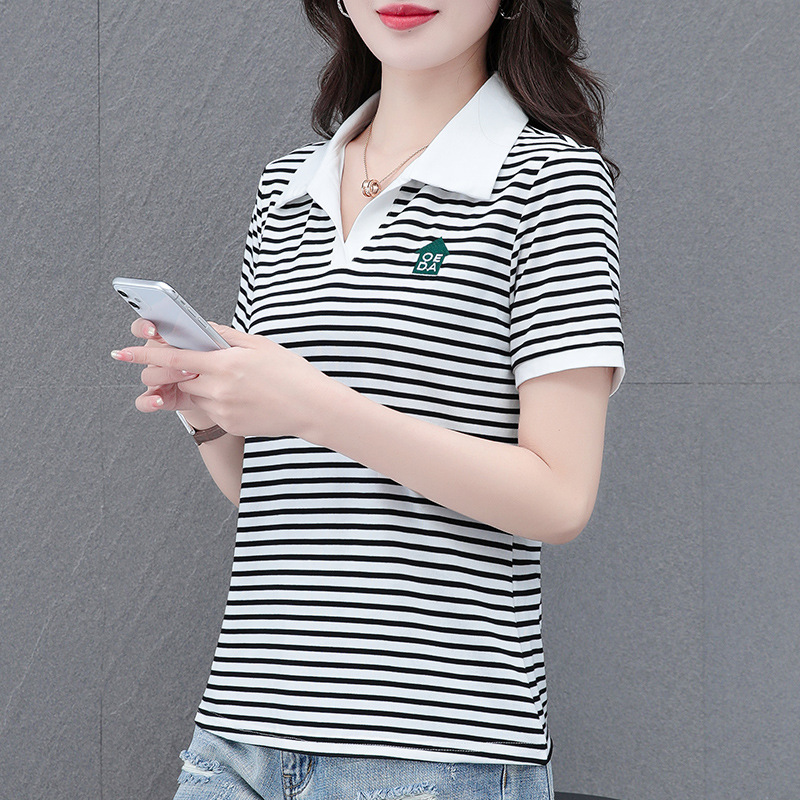 Lapel striped T-shirt for women's summer 2024 new style, fashionable and slimming, versatile casual short-sleeved polo shirt, loose top