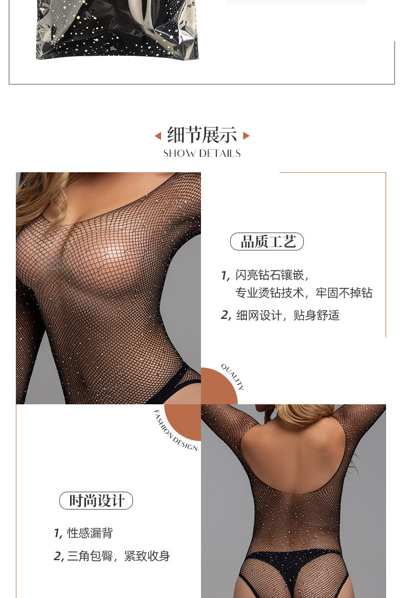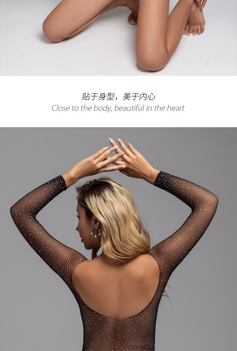 Large-sized, shiny rhinestone, embossed diamond mesh, cut-out top, one-piece, women's see-through long-sleeved embossed diamond mesh top