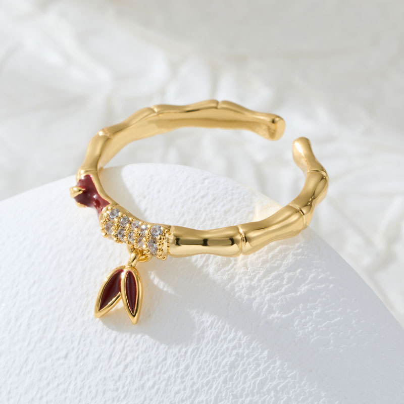 Light luxury Chinese-style bamboo joint open ring, copper alloy micro-inlaid zircon enamel oil drip pendant design, adjustable ring
