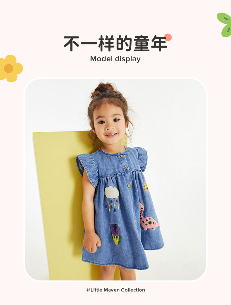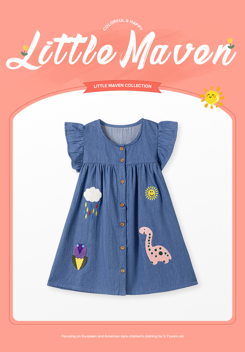 Little maven European and American girls' short-sleeved denim skirt, summer children's skirt, patchwork embroidered cartoon fashion children's skirt