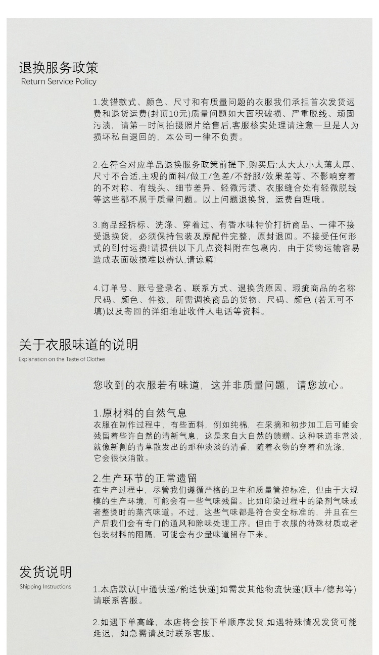 When factories process sweaters, in pursuit of a better appearance and feel, they will carry out certain treatments, which will also result in a few loose hairs remaining on the surface of the sweaters. These loose hairs will gradually fall off during subsequent wearing through friction and washing. It will not affect the quality of the sweater. For the problem of hair loss, you can try some simple treatment methods. For instance, use transparent tape or a lint remover to remove the loose fibers, or choose to wash the sweater with anti-static laundry detergent to reduce the occurrence of shedding. This phenomenon can be greatly alleviated through proper handling and maintenance. Sweater Purchase Tips: Thoughtful Tips on Shrinking Dear customer, thank you for choosing our sweater products! To ensure that you purchase satisfactory clothes, please carefully read the following precautions about sweater shrinkage before making a purchase: Shrinkage is a common characteristic of natural fabrics Natural materials such as wool, cashmere and cotton may slightly shrink (about 3% to 5%) when washed or heated due to the characteristics of the fibers. This is a normal phenomenon and not a quality issue. Synthetic fibers (such as polyester and acrylic) have a relatively low shrinkage rate, but their air permeability and warmth retention are relatively weak. 2. When making a purchase, it is recommended to "leave some leeway If you prefer a well-fitting effect, you can choose according to the normal size. If you are worried about shrinking, it is recommended to choose a size larger (especially for those with a high wool content). Refer to the "Fabric Composition" and "Washing Suggestions" on the product detail page. Special attention should be paid to the care methods for high-proportion wool (>50%). 3. Proper care can reduce the risk of shrinkage Washing method: It is recommended to hand wash or choose the "wool mode" of the washing machine. The water temperature should be ≤30℃ and avoid prolonged soaking. Drying method: Lay flat and dry in the shade. Do not hang or expose to direct sunlight to prevent deformation. Ironing technique: Iron with a medium or low-temperature cloth to avoid direct contact with the fibers. |