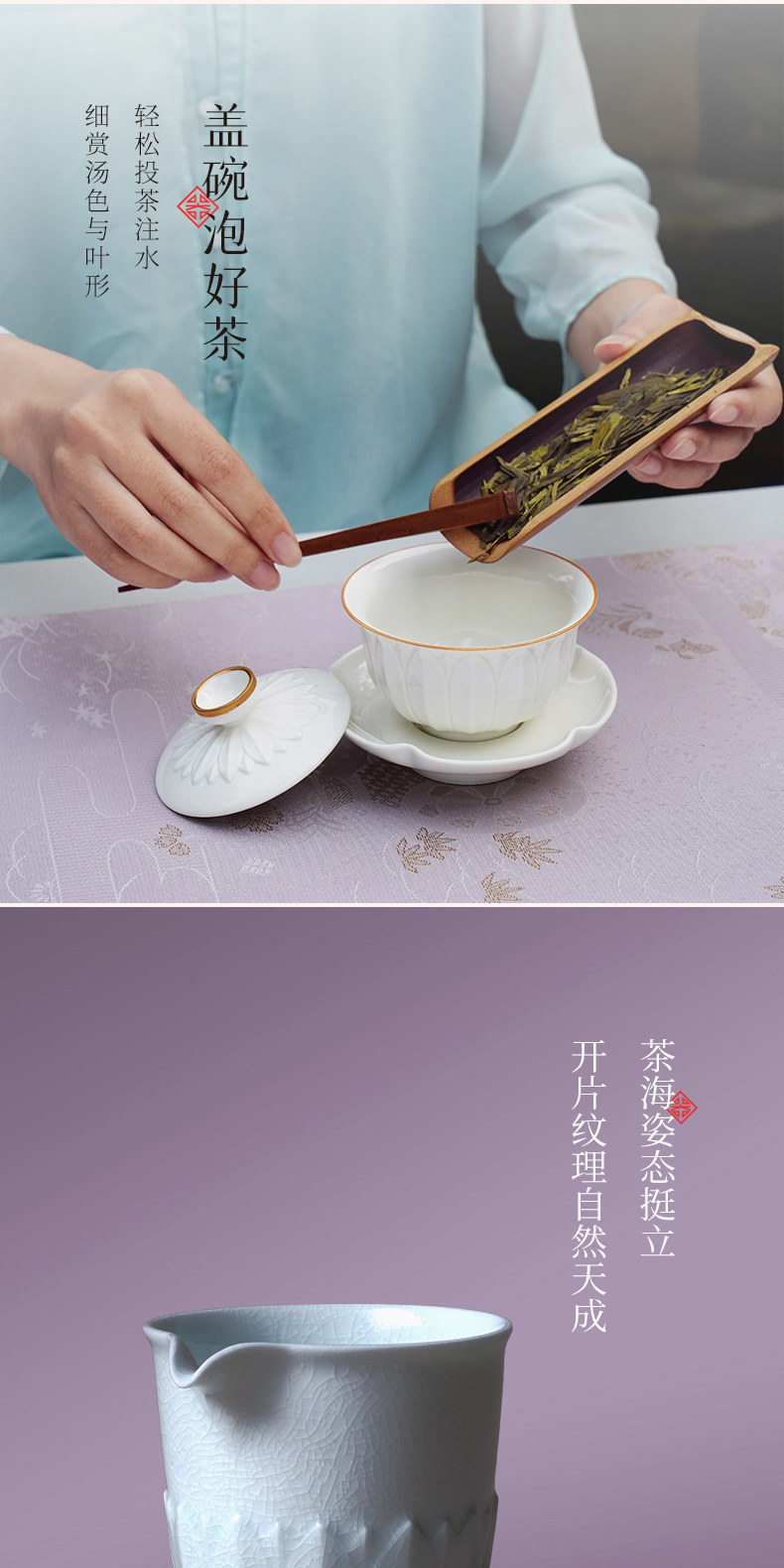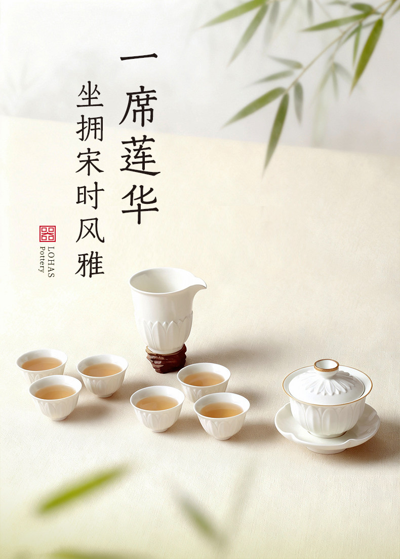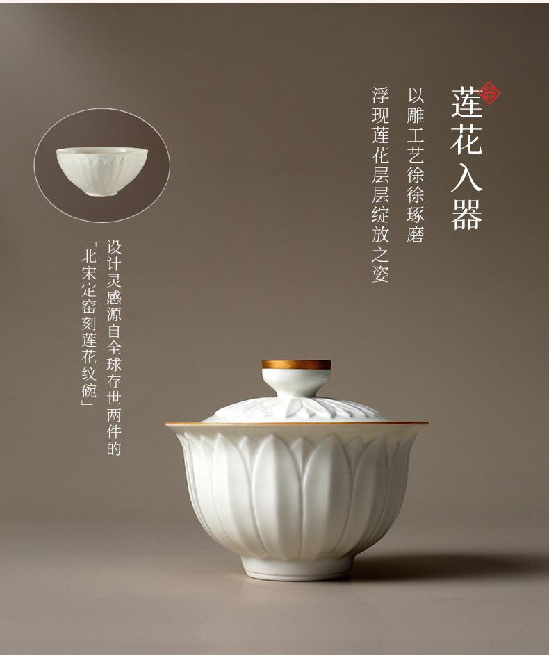 Lu Bao's new product, the Song Dynasty Charm Ding Kiln Lotus Pattern Covered Bowl Tea Set, is an elegant gift box for elders, friends, leaders and clients