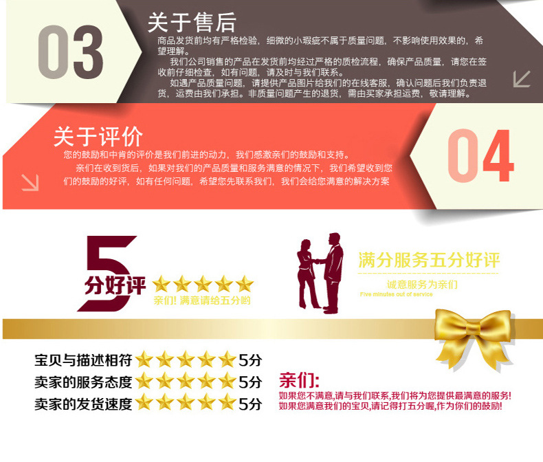 Dear customers, after receiving the goods, if you are satisfied with the quality of our products and our service, we hope to receive your encouraging positive feedback. If you have any questions, please contact us first and we will provide you with a satisfactory solution.
