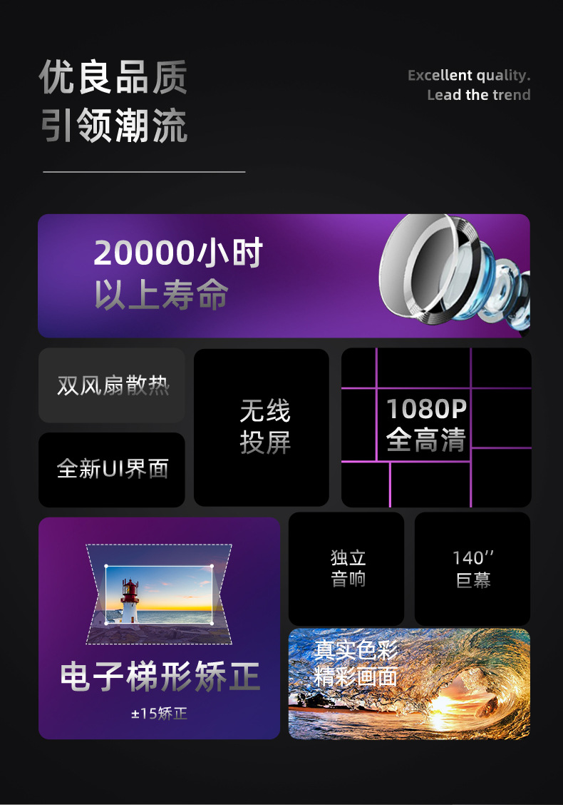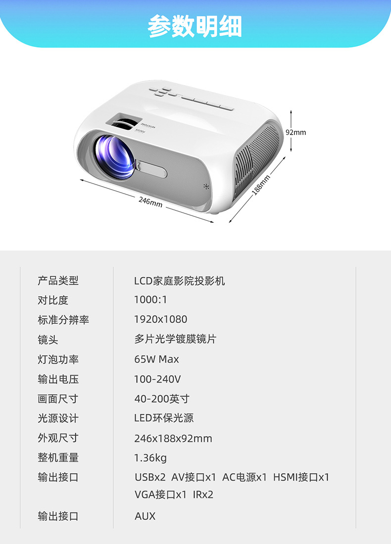 The accessories include: projector main unit *1+ power cord *1+ remote control *1+ manual *1+ packaging box *1