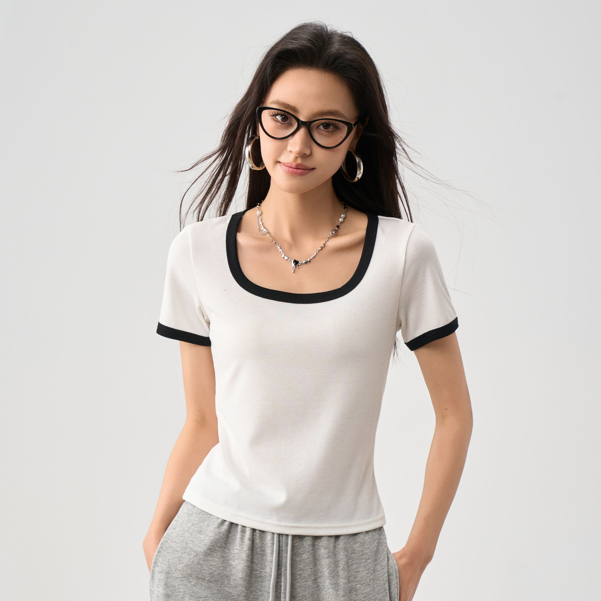 【 UCos Color-Blocking Equation T】 Women's wear: Summer New plus-size UCos French square Neck collarbone color-blocking T-shirt for women
