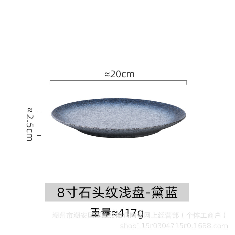 An 8-inch shallow plate with stone patterns in a deep blue color