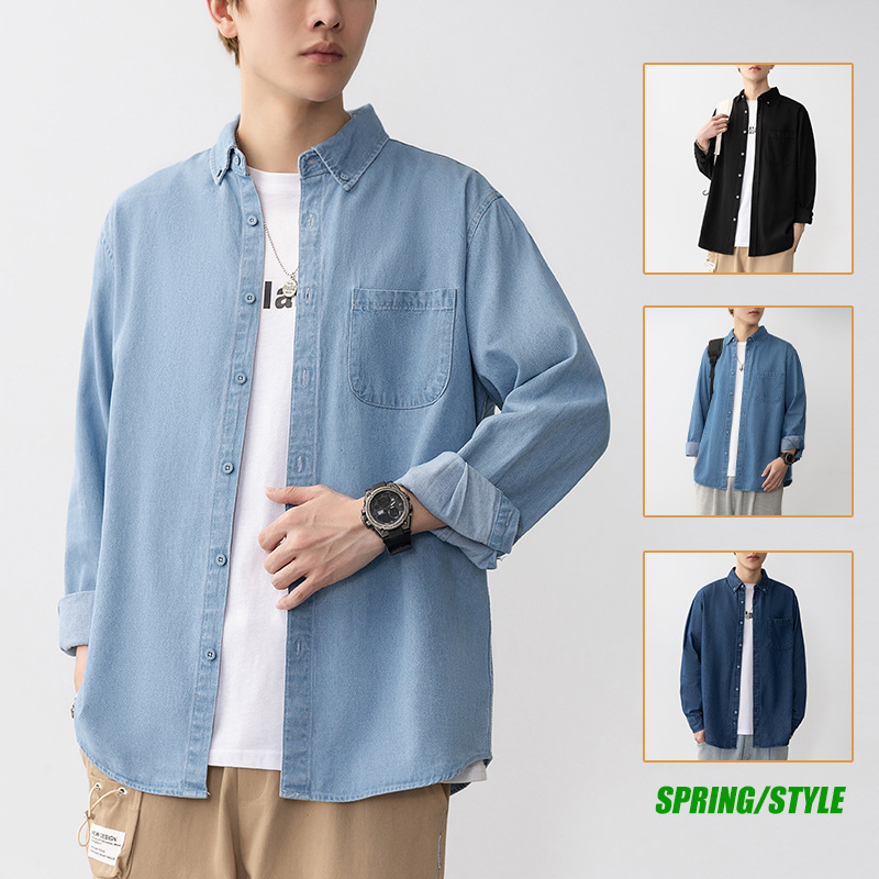 Long-sleeved denim shirt for men, cool and retro workwear shirt, thin Japanese-style casual denim jacket for men, trendy style