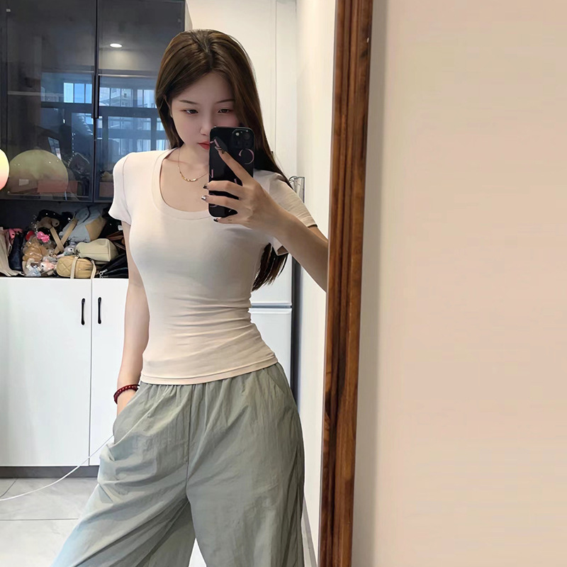 Miaoanna shoulder T-shirt for women's summer short-sleeved V-neck, round neck, thickened waist-cinching and slimming design, American spice girl top
