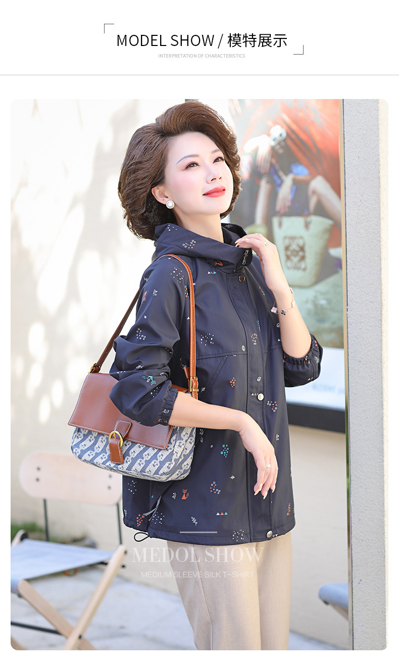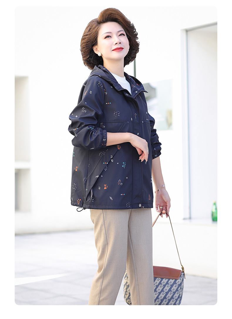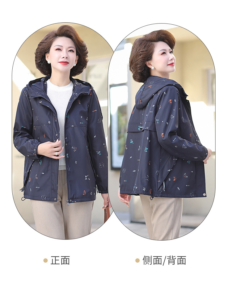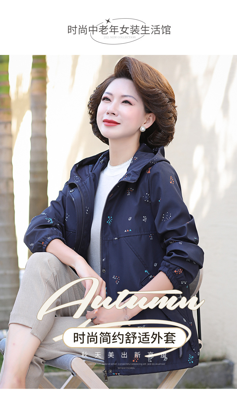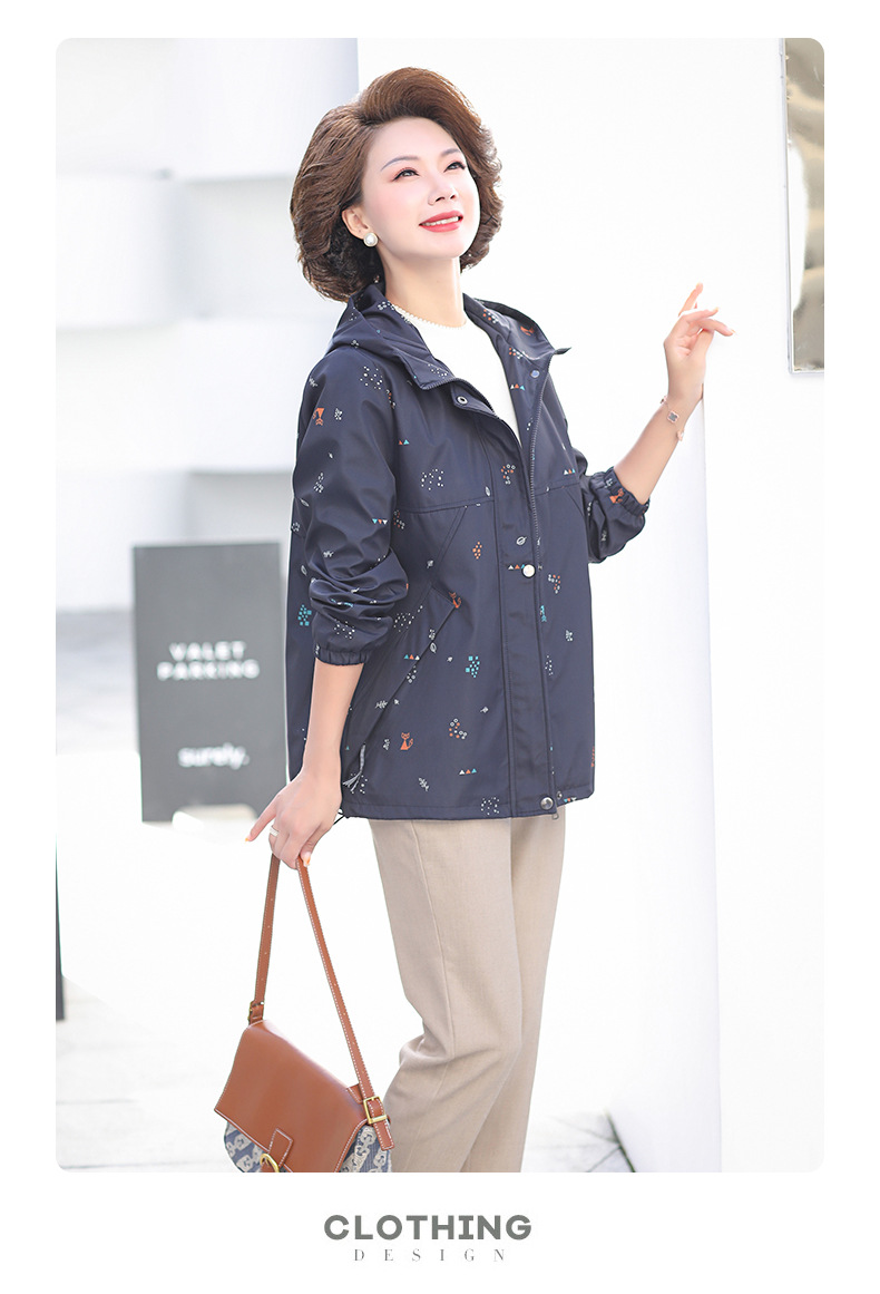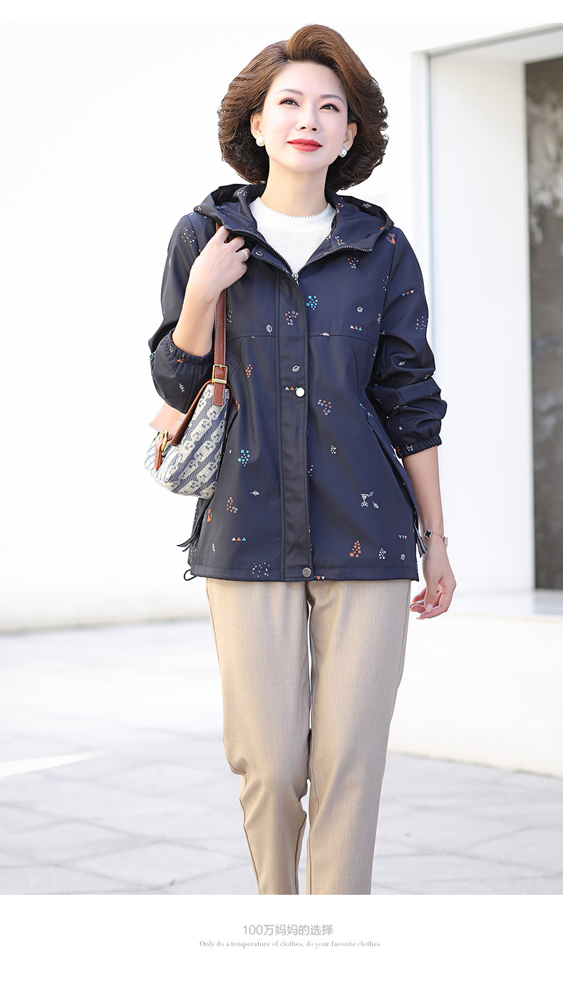 Mom's new autumn trench coat, middle-aged hooded, slimming, large-sized floral casual jacket, top for middle-aged and elderly women