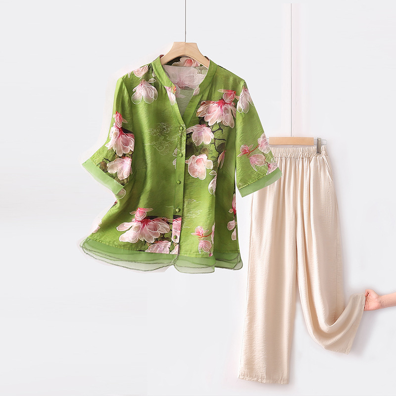 A new summer dress for middle-aged and elderly mothers, a cool and comfortable two-piece set with printed thin short-sleeved cardigan T-shirt