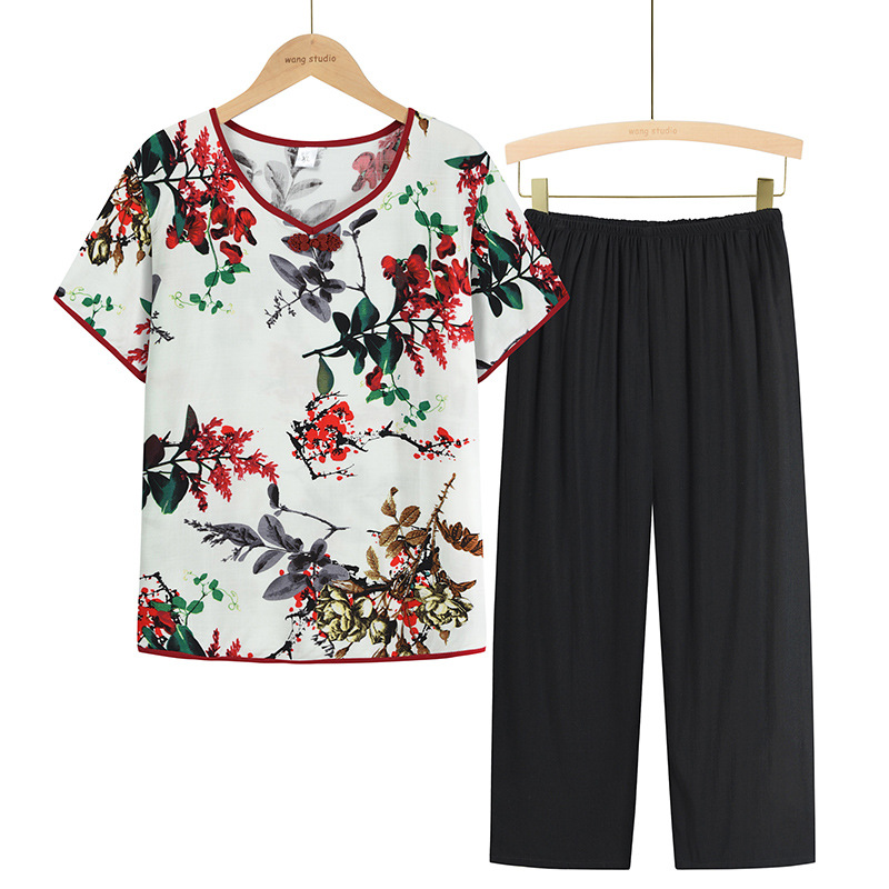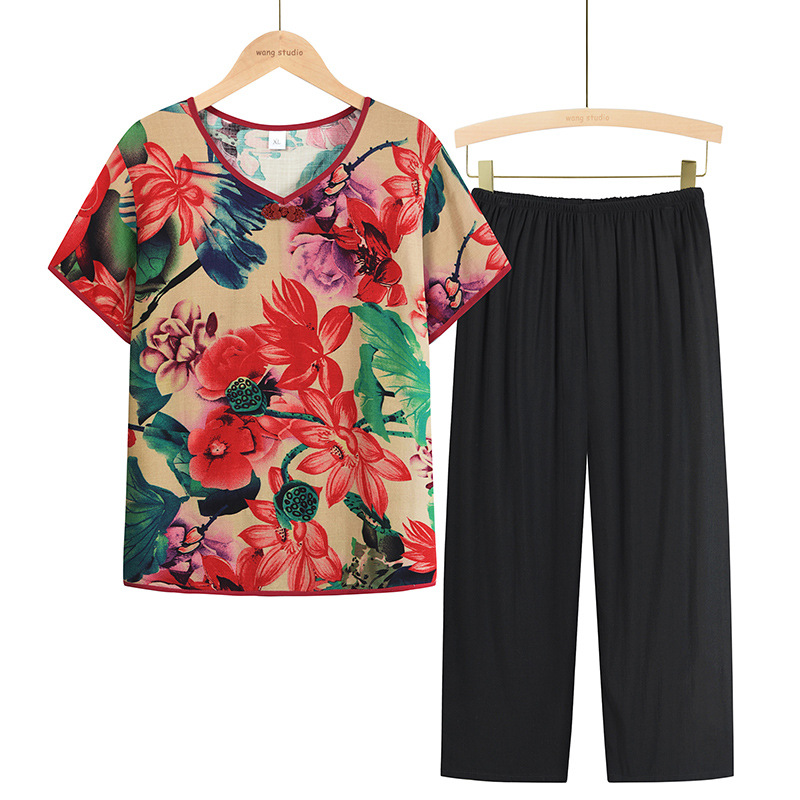 Mom's summer new plus-size women's set, short-sleeved T-shirt, loose cotton and linen top for middle-aged and elderly women's wear, two-piece set