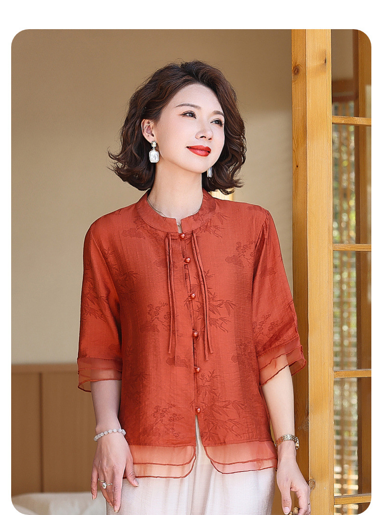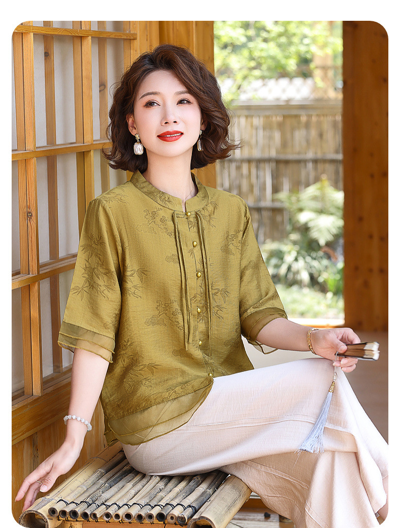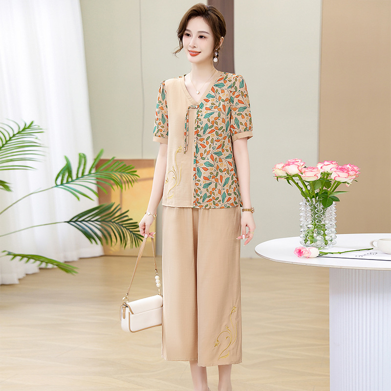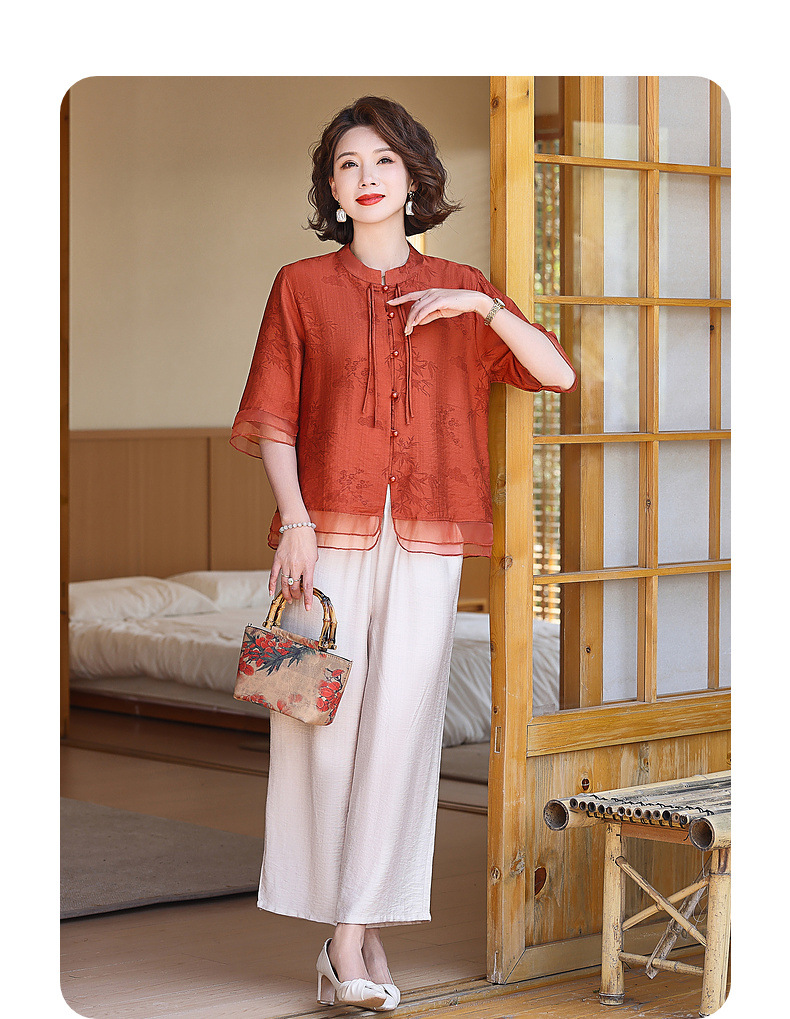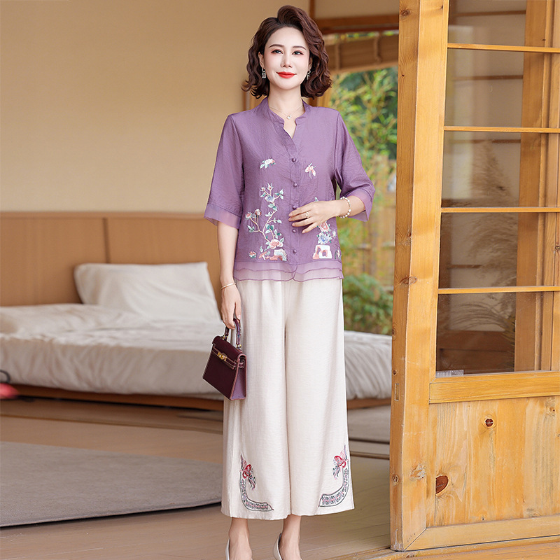 A two-piece set of loose-fitting, slimming and thin Chinese-style shirt with Chinese-style embroidery imitating cotton and linen for mothers. Summer lady's top