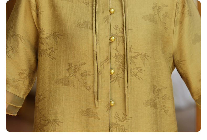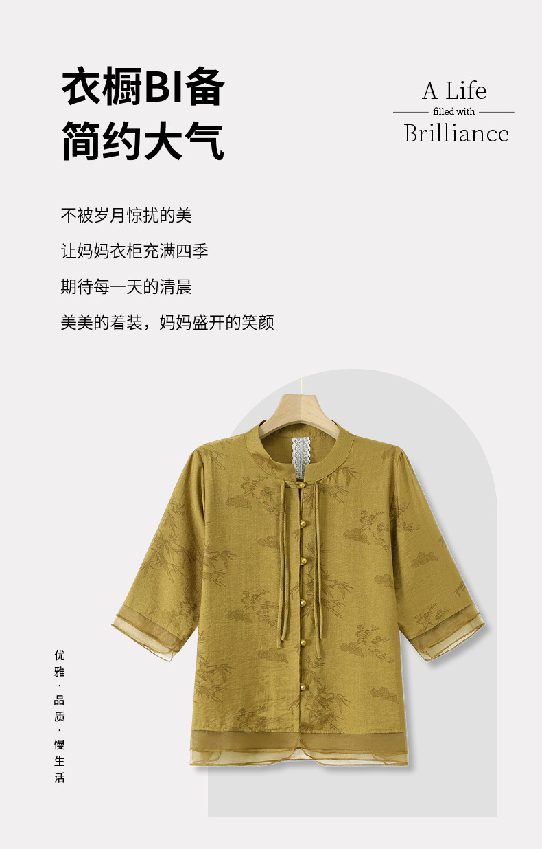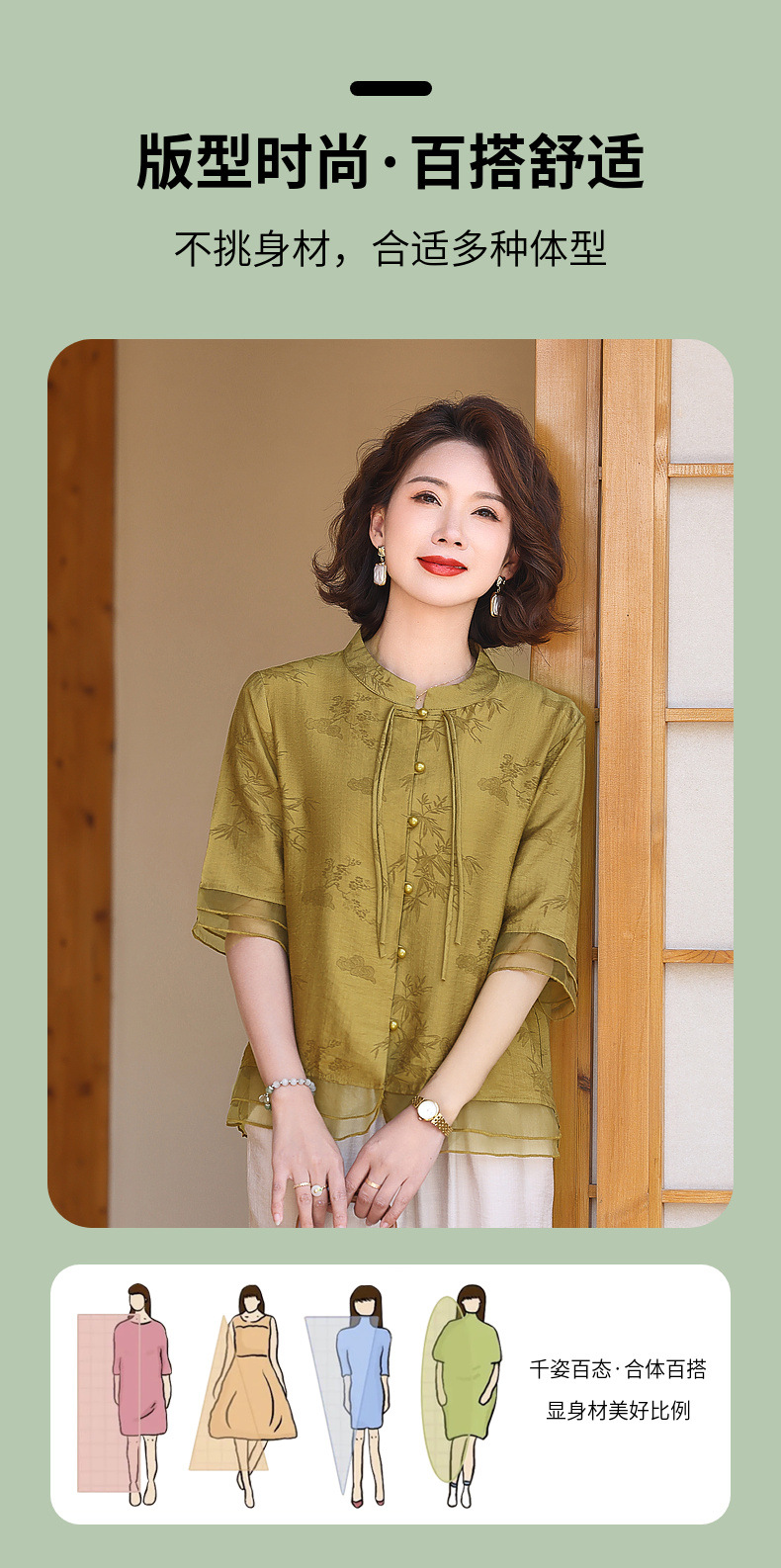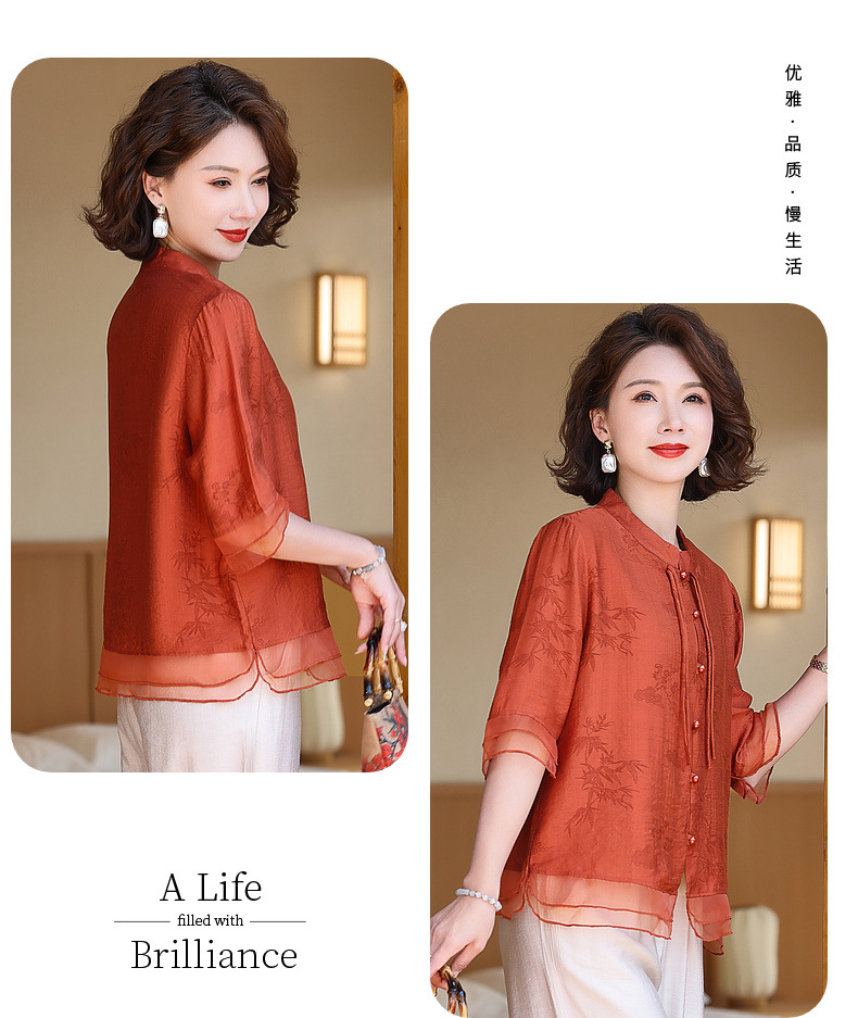 A two-piece set of loose-fitting, slimming and thin Chinese-style shirt with Chinese-style embroidery imitating cotton and linen for mothers. Summer lady's top