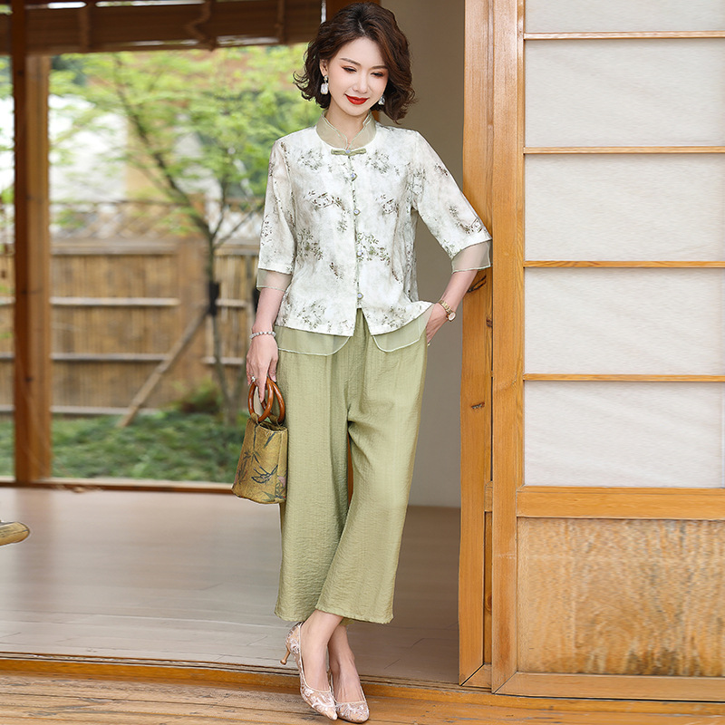 Young Mom Summer 2024 New Style Lady's New Chinese-style button-up set, fashionable two-piece set for middle-aged moms