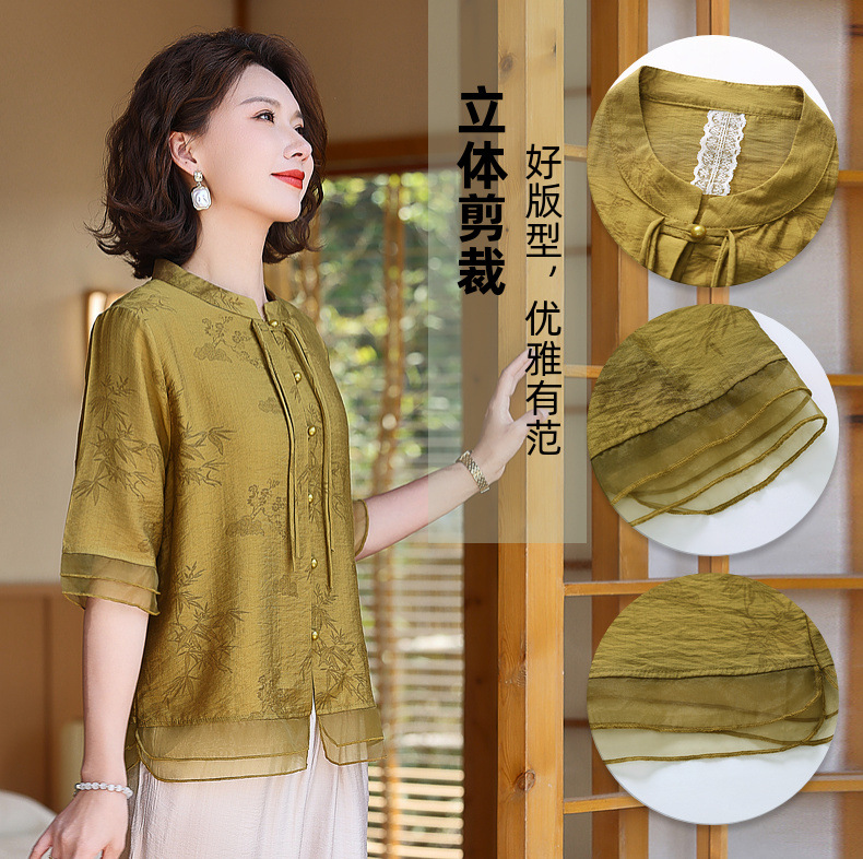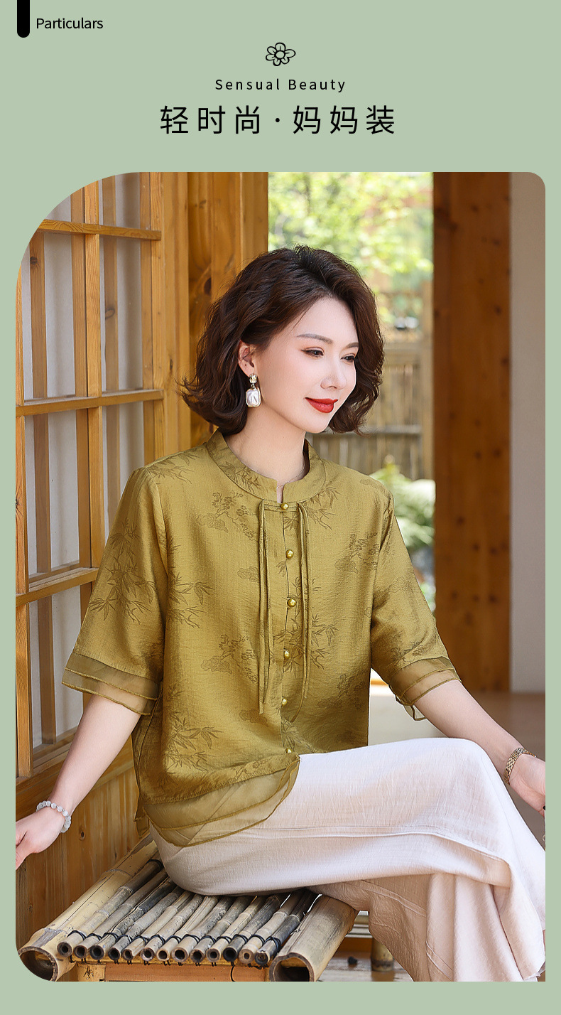 Mom's stylish Chinese-style casual middle-aged women's summer short-sleeved top, large-sized thin V-neck suit for middle-aged and elderly people