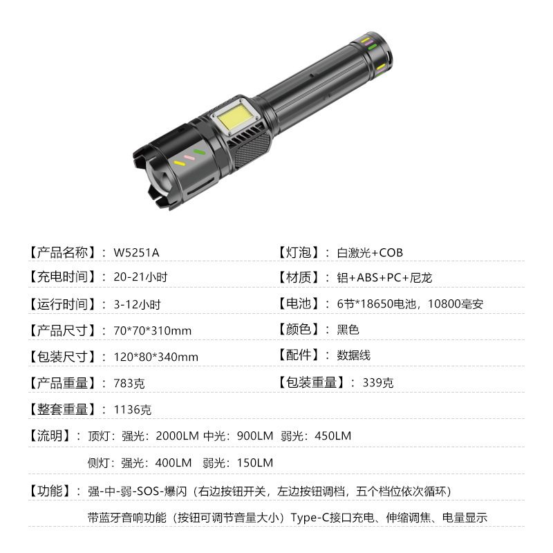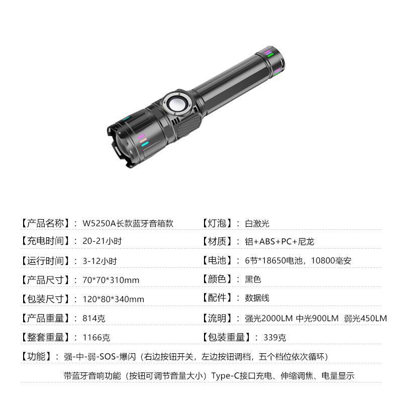 Multi-speed adjustable telescopic zoom long-range flashlight, side light, camping night light, outdoor lighting, hand-held flashlight
