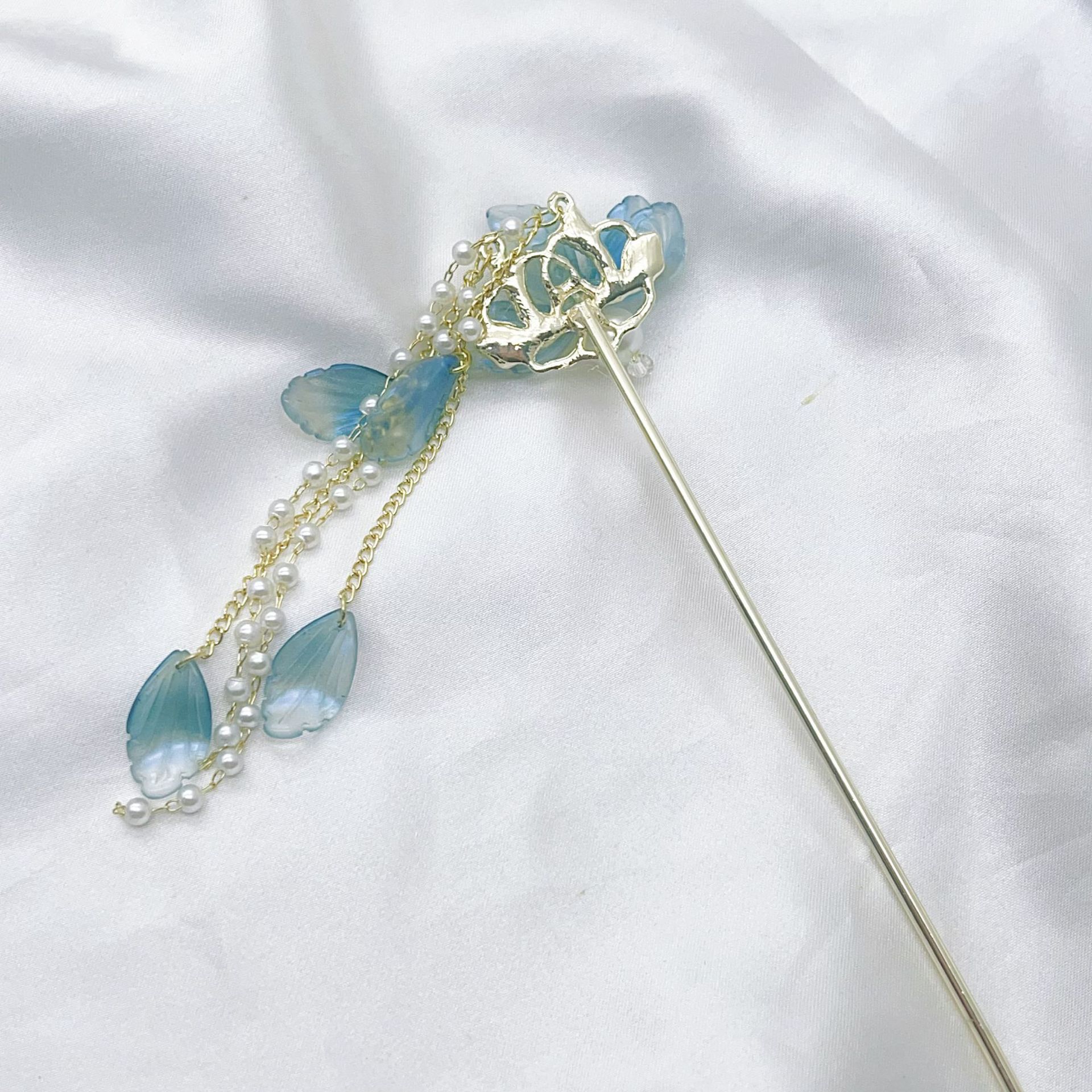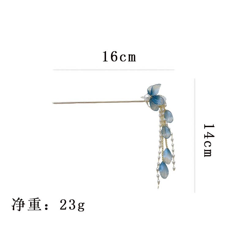 National style, national trend, ancient style blue flower hairpin, high-end feel, new Chinese style pearl tassel, step shaking women's hair accessory, hairpin, head accessory, hairpin