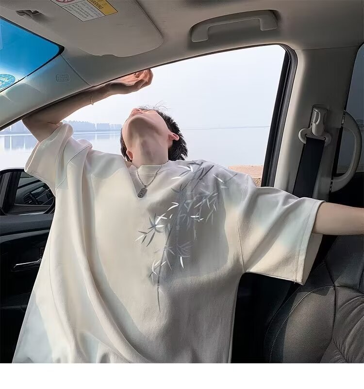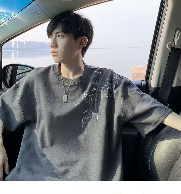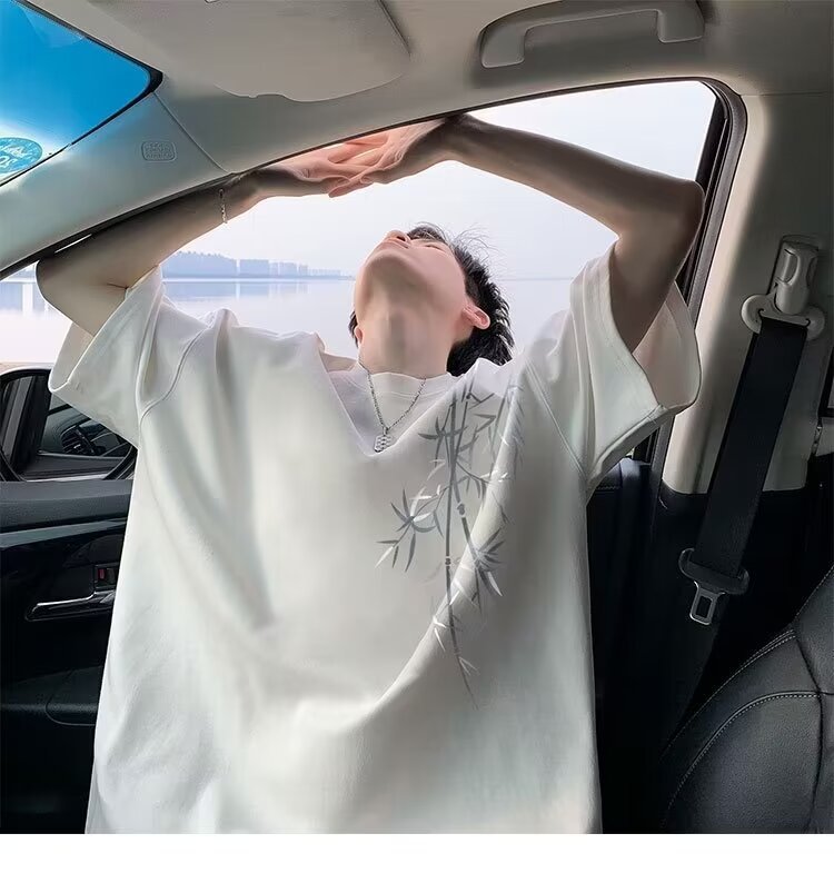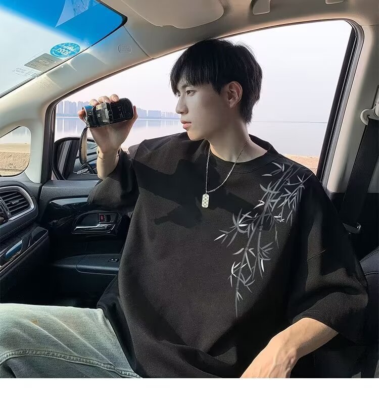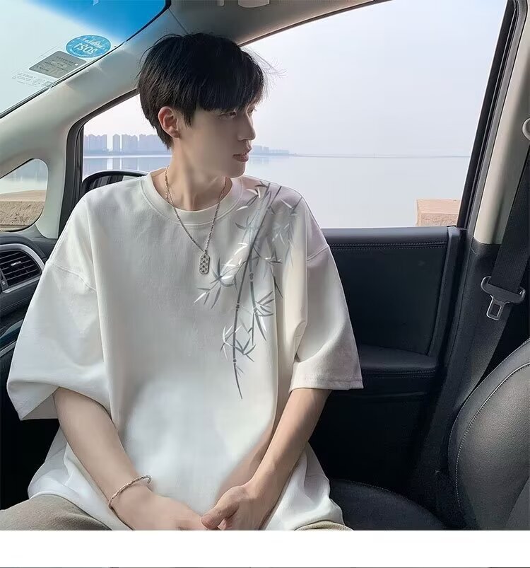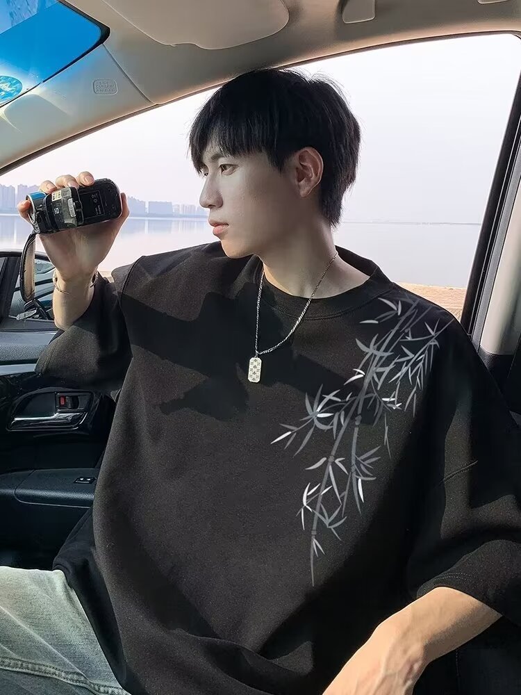 "National Trend 2024: New Chinese-style bamboo printed short-sleeved T-shirt for men's summer, a thin and trendy brand, large-sized half-sleeve for casual wear.