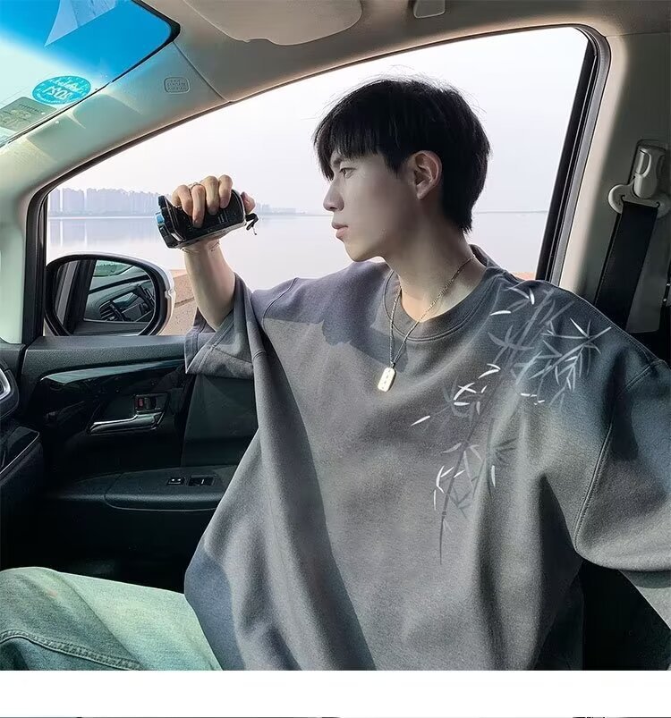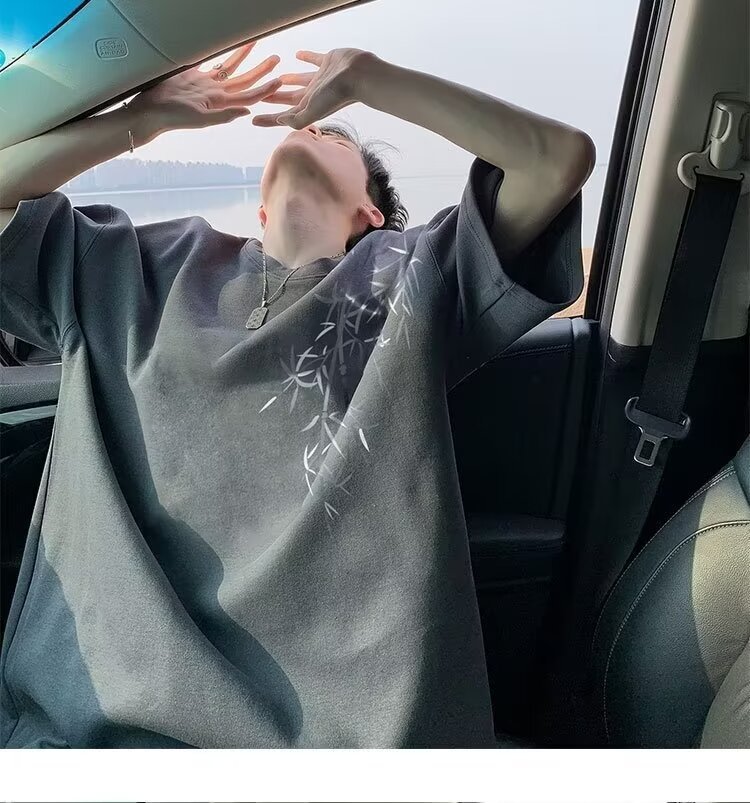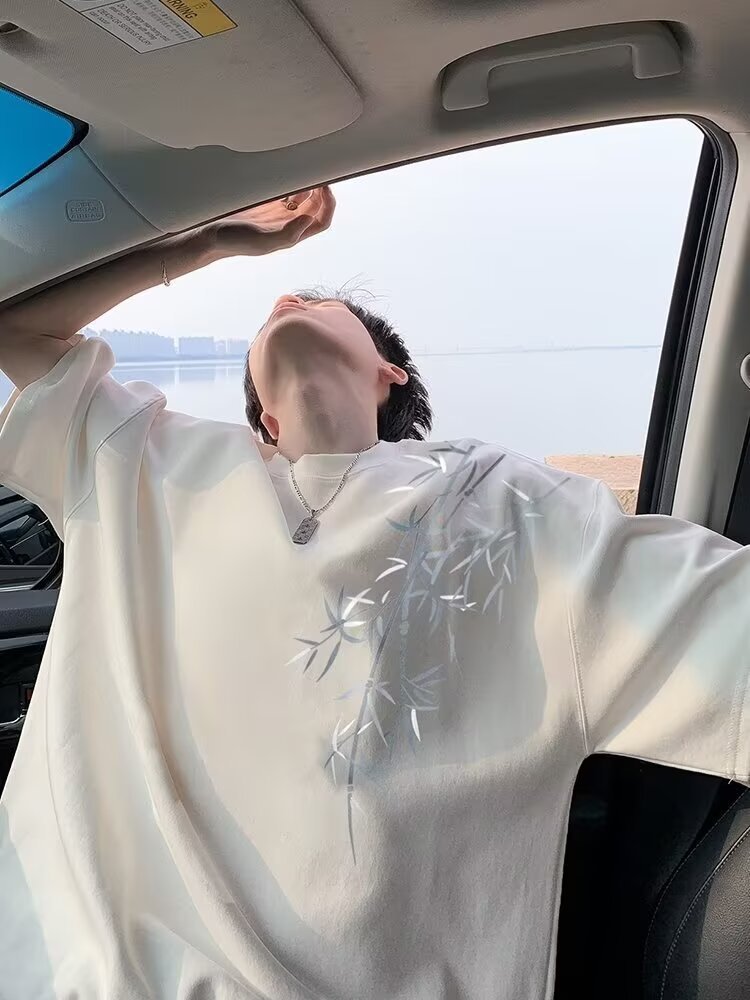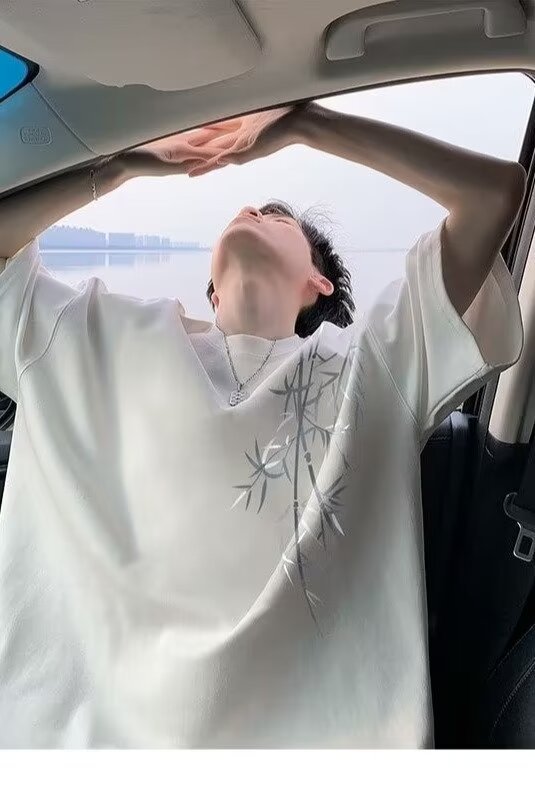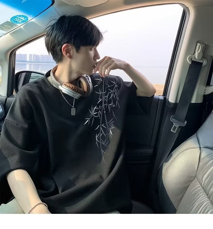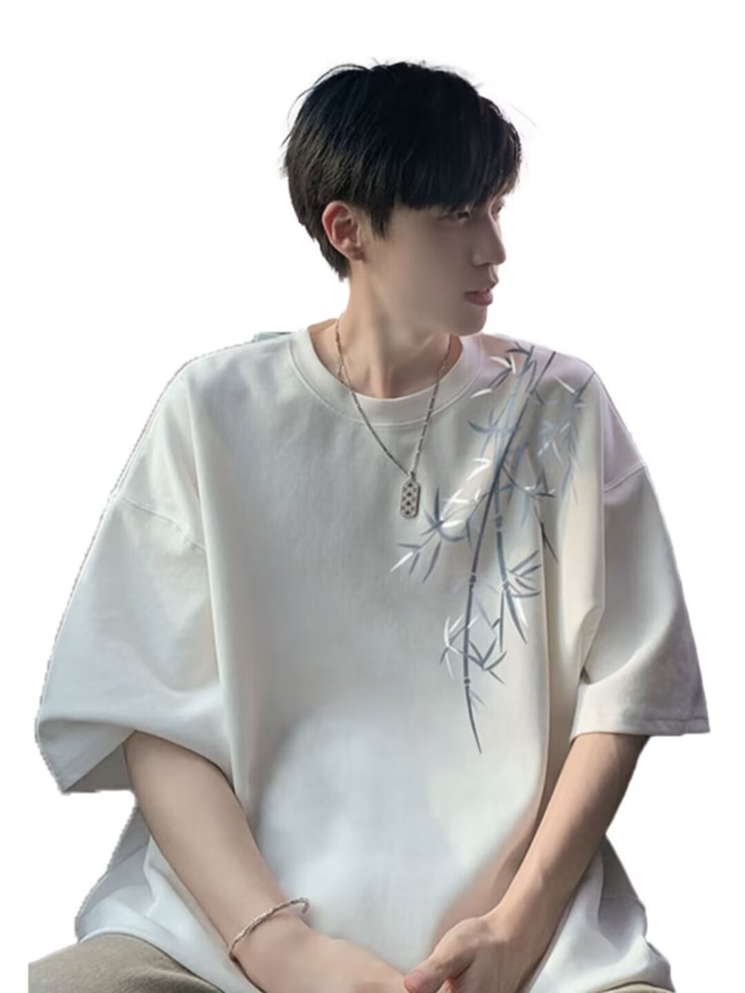 "National Trend 2024: New Chinese-style bamboo printed short-sleeved T-shirt for men's summer, a thin and trendy brand, large-sized half-sleeve for casual wear.