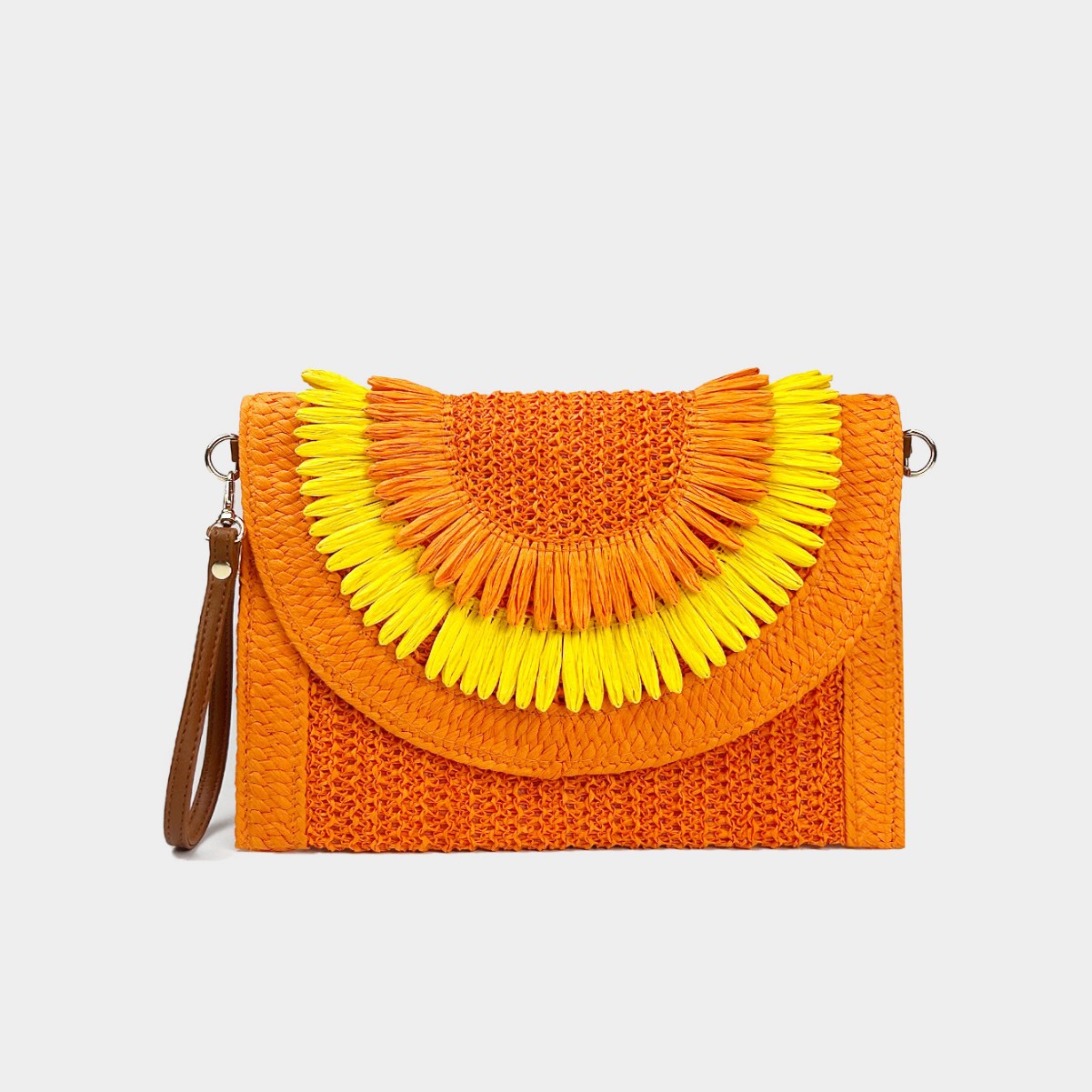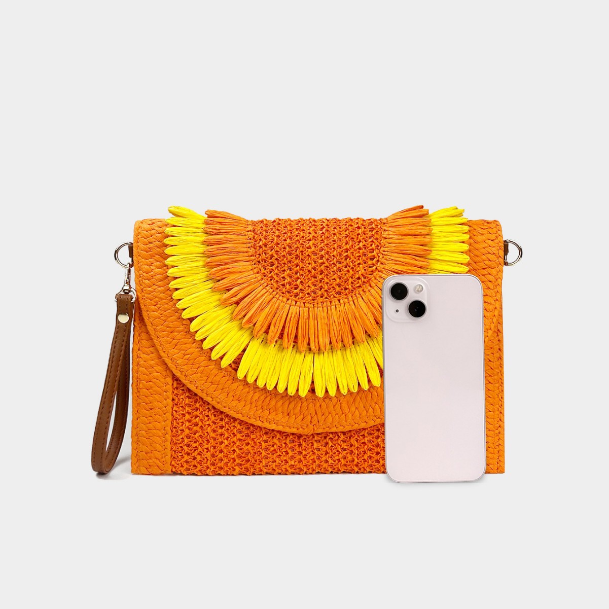 "National trend bag, women's envelope bag, Sunflower 2025 New style color-blocked straw-woven crossbody phone bag, flip cover small square bag.