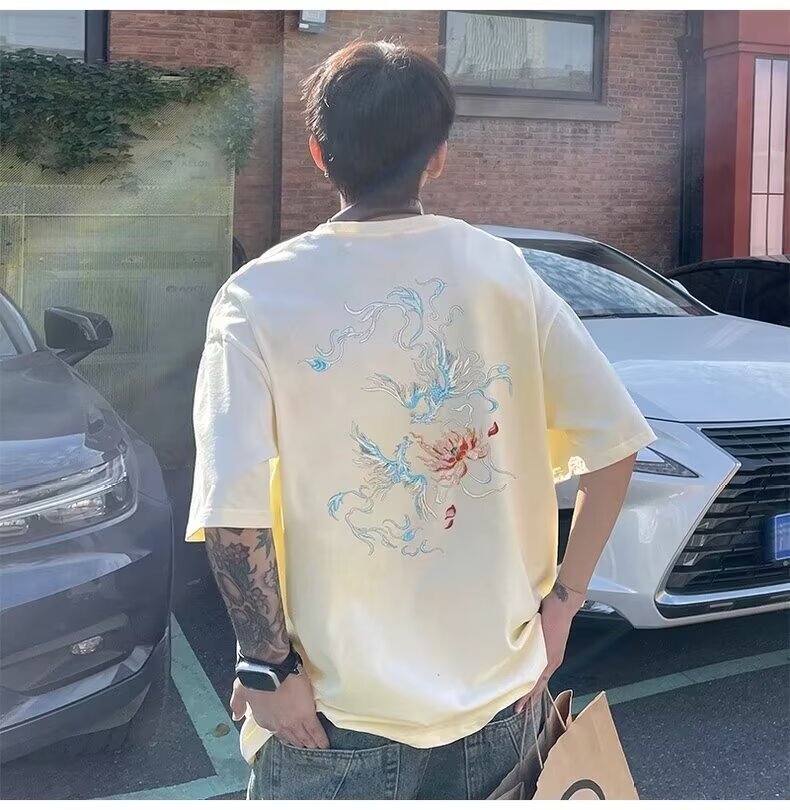 "National trend Chinese-style clothing, white pure cotton short-sleeved T-shirt for men, loose and large-sized, Phoenix Streetwear brand's heavyweight half-sleeved summer.