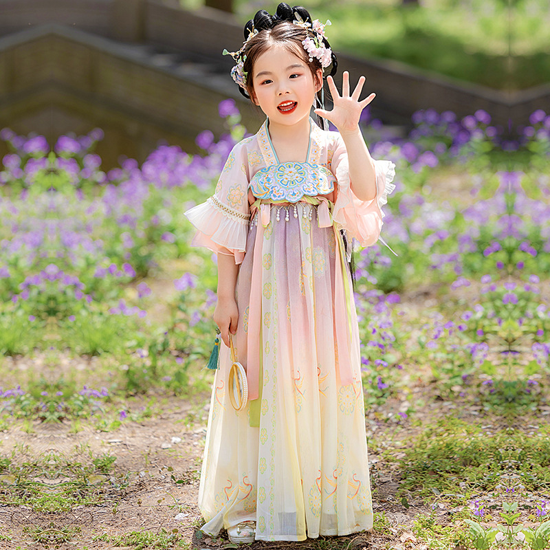 "National Trend Girls' Hanfu 2025 New Summer Children's ancient costume Super fairy-like girl High-end Chinese-style daily half-sleeved princess dress.