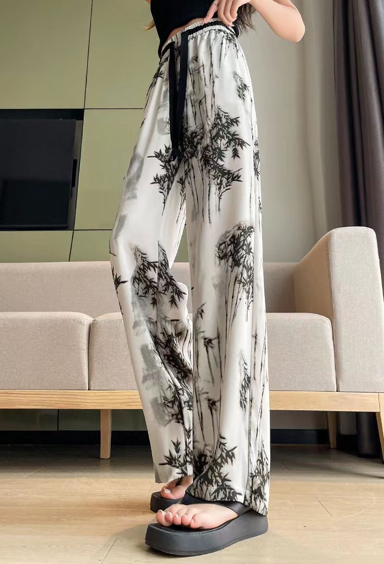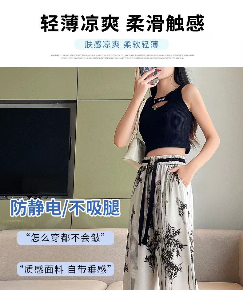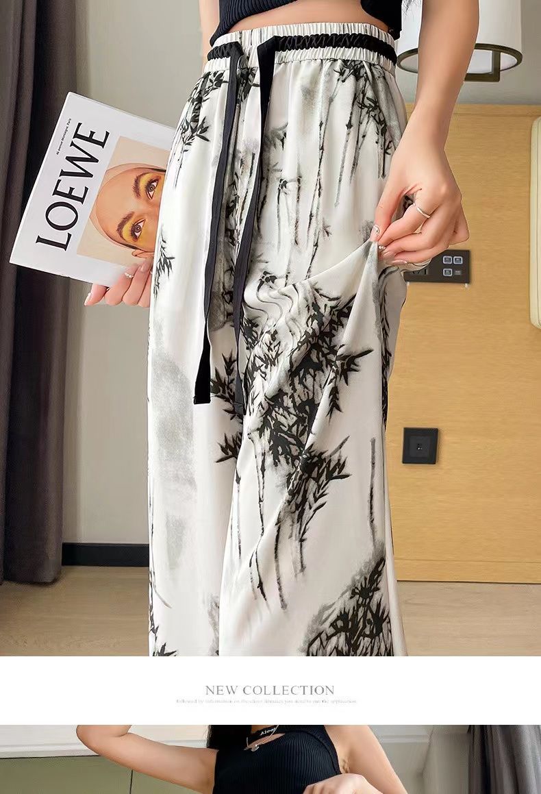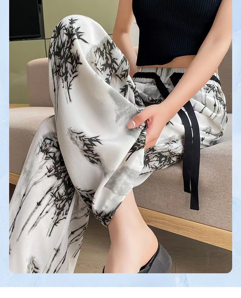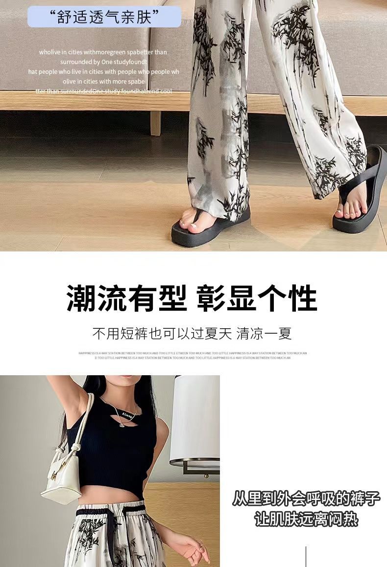 "National Trend ice Silk wide-leg pants for women's summer thin style 2025 New Chinese-style ink-wash pants, national style fairy cool chiffon sun protection pants.