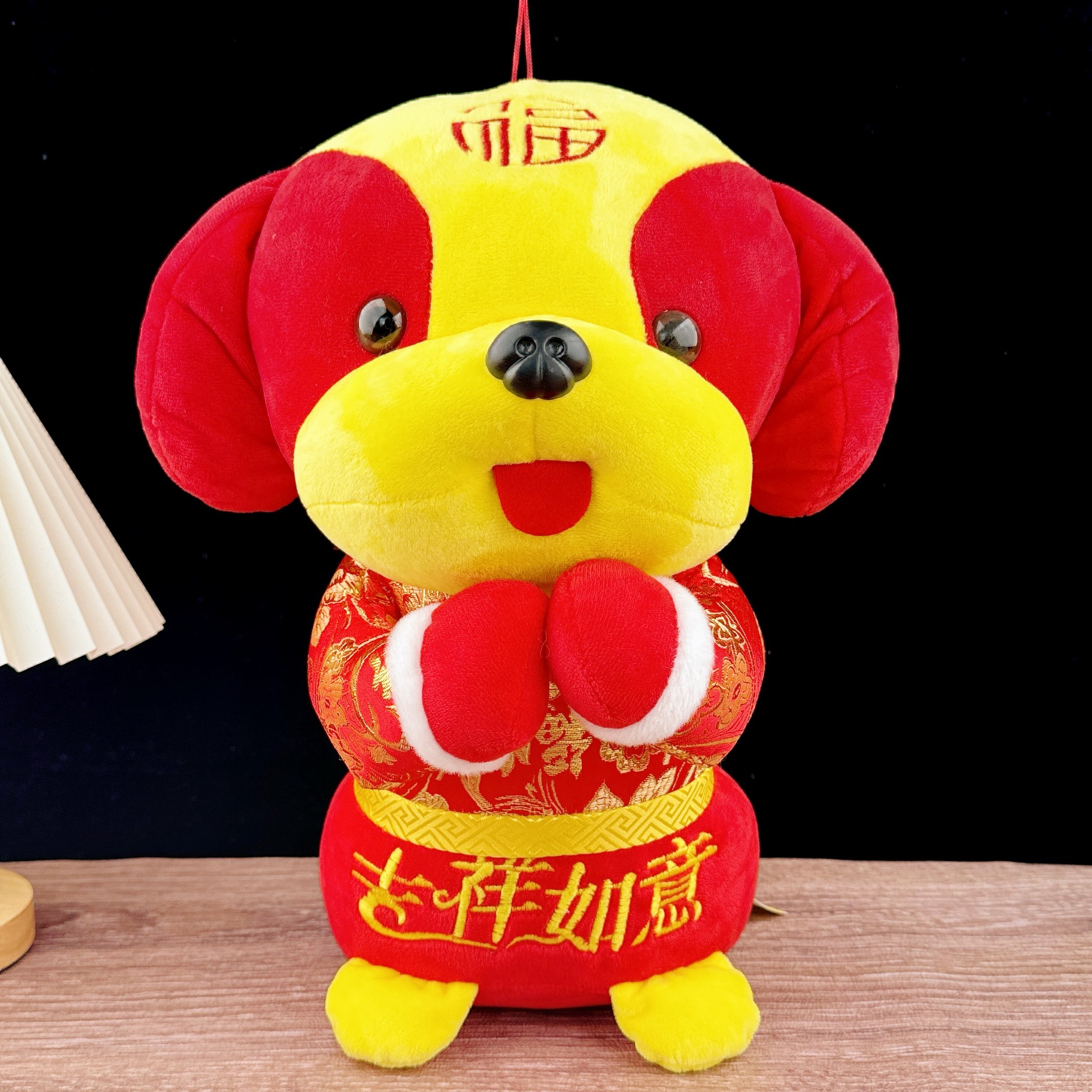 A large New Year greeting dog wishing you a prosperous year