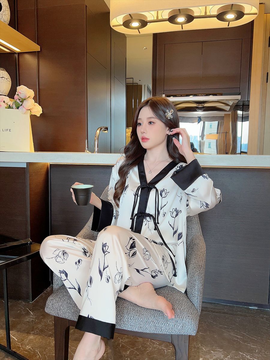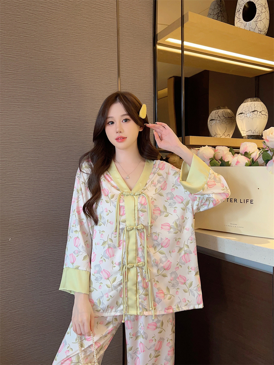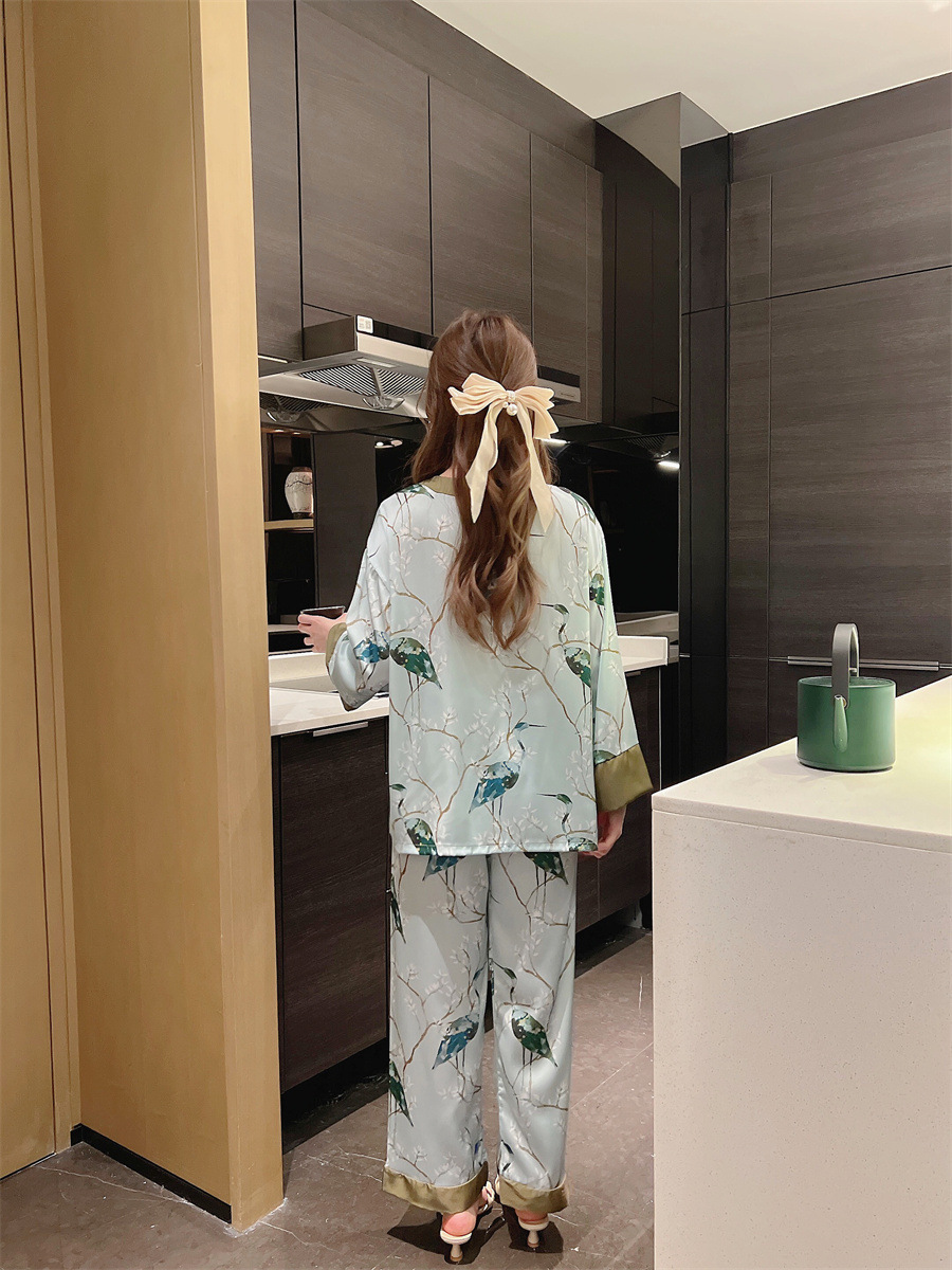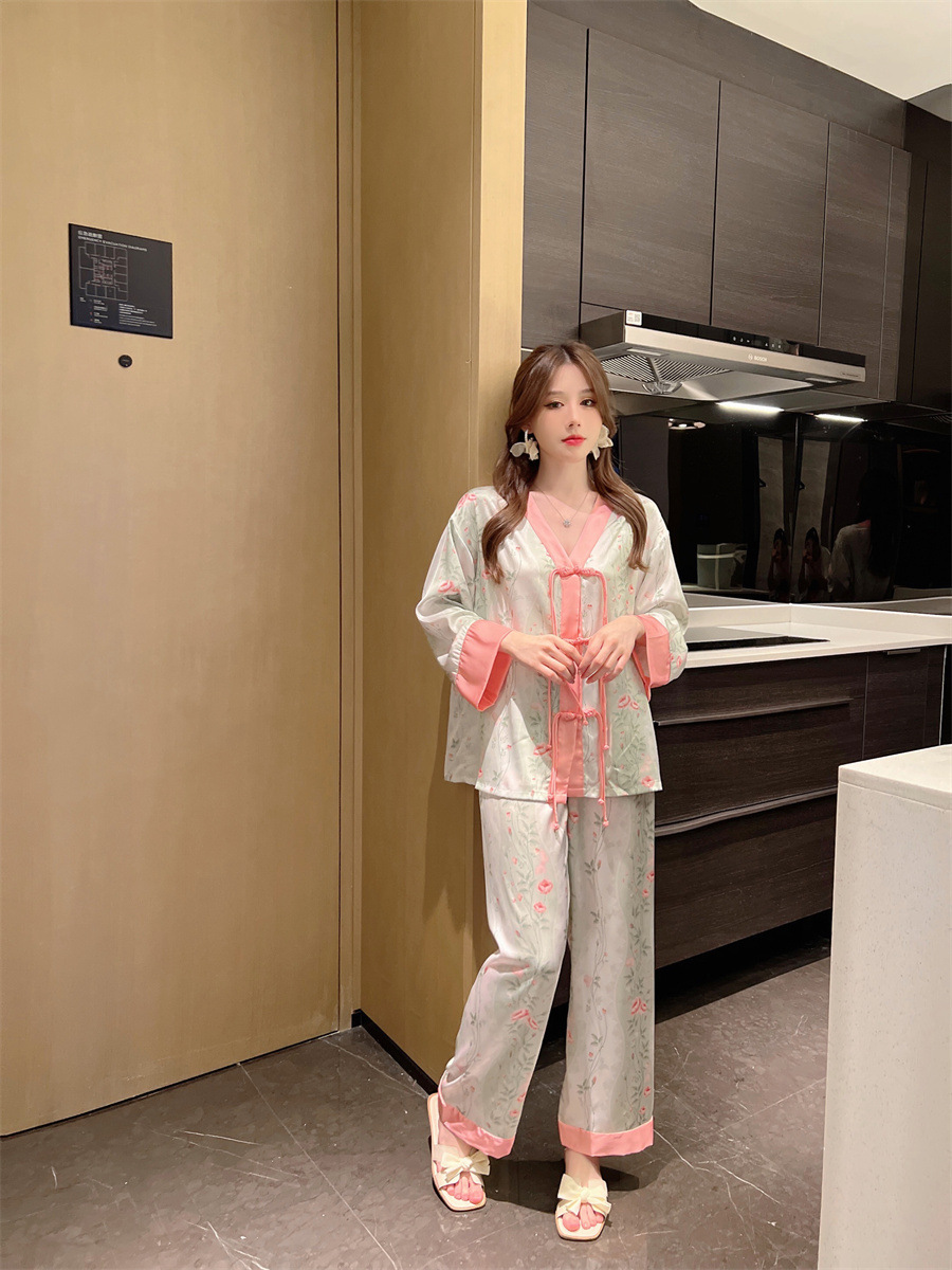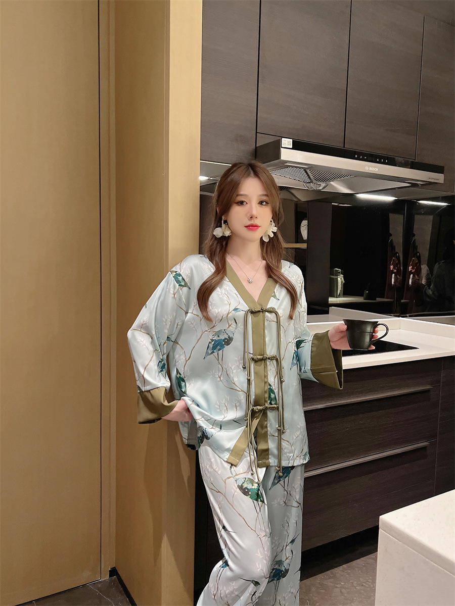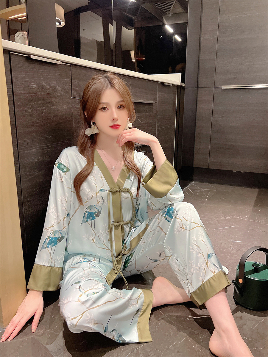 "National trend pajamas for women, ice and snow silk, national trend style for women, long-sleeved shirts and long pants, new autumn and winter home wear sets, button-up pajamas.