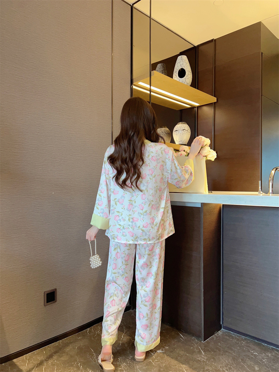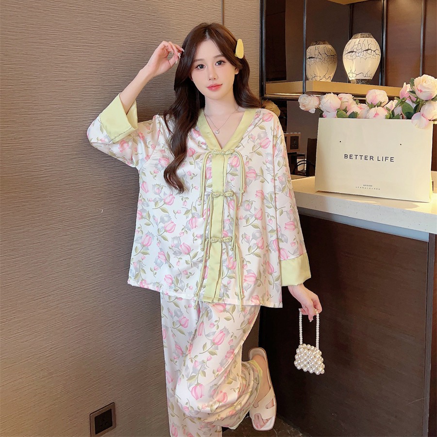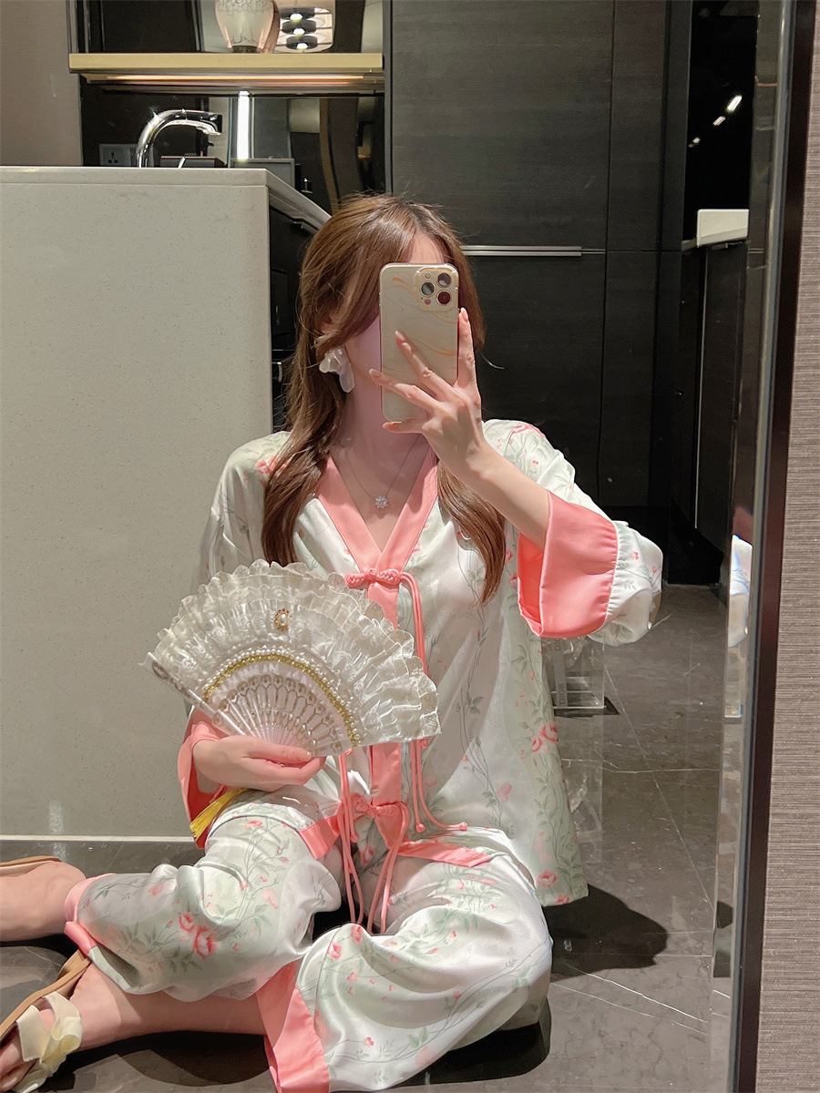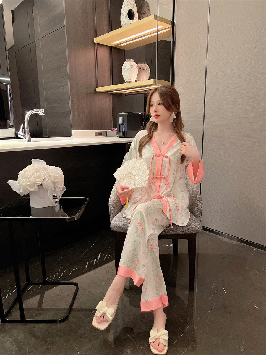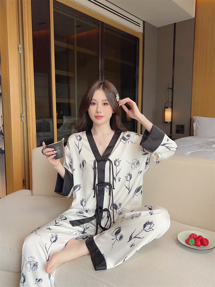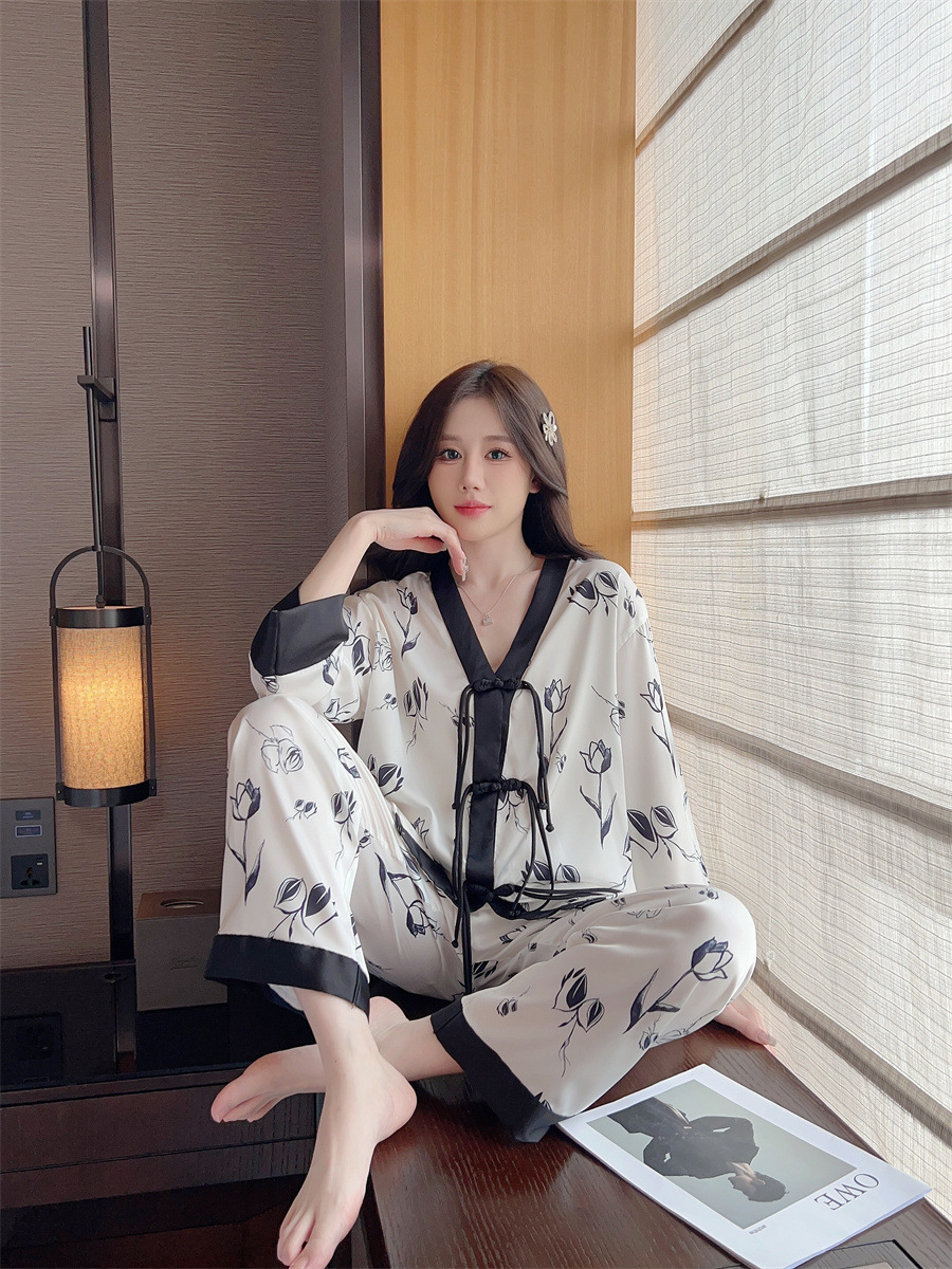 "National trend pajamas for women, ice and snow silk, national trend style for women, long-sleeved shirts and long pants, new autumn and winter home wear sets, button-up pajamas.