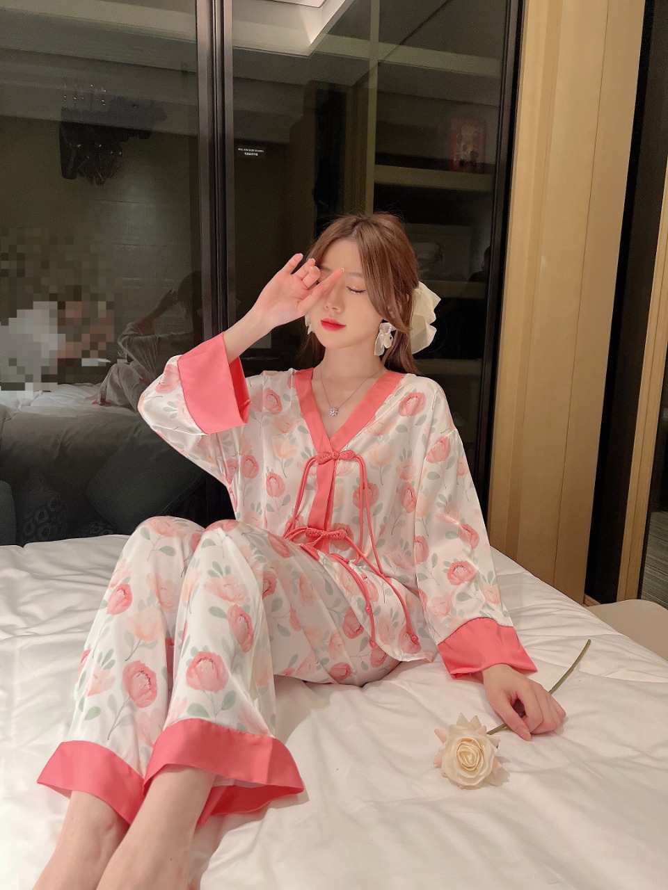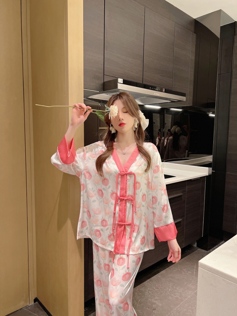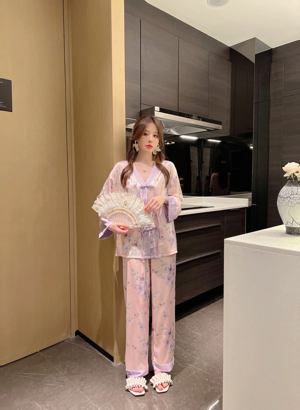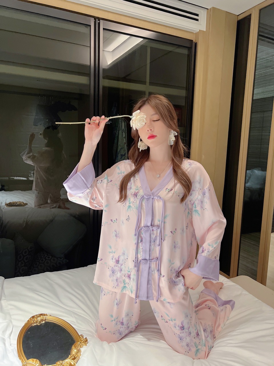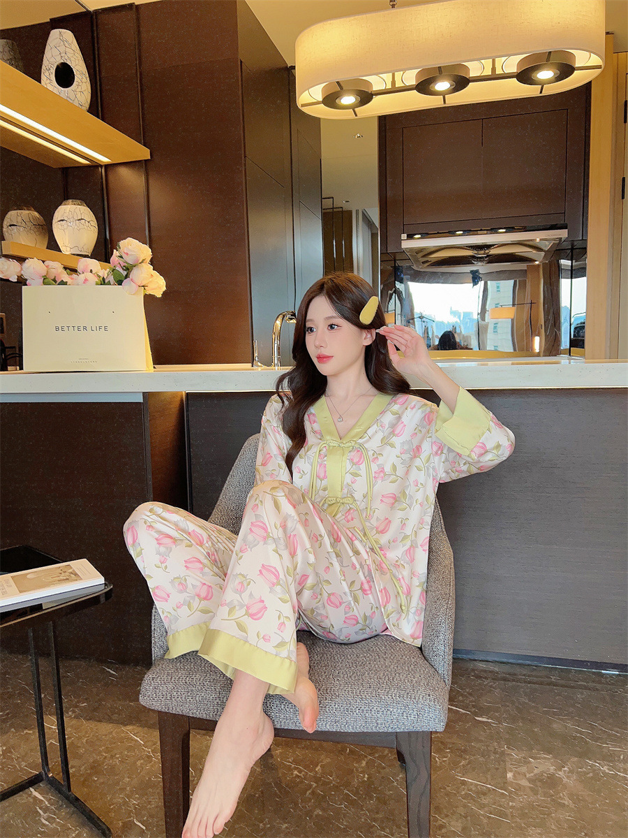 "National trend pajamas for women, ice and snow silk, national trend style for women, long-sleeved shirts and long pants, new autumn and winter home wear sets, button-up pajamas.