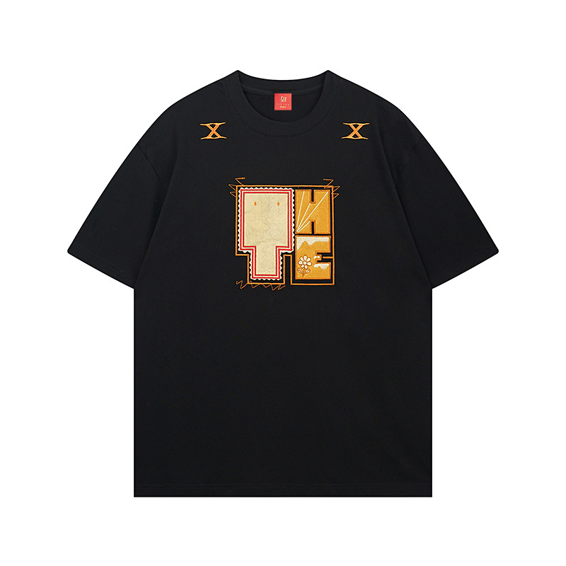 "National trend short-sleeved T-shirt with cartoon geometric embroidery, Chinese style, round neck, pure cotton loose, heavy half-sleeve 2025 new style.