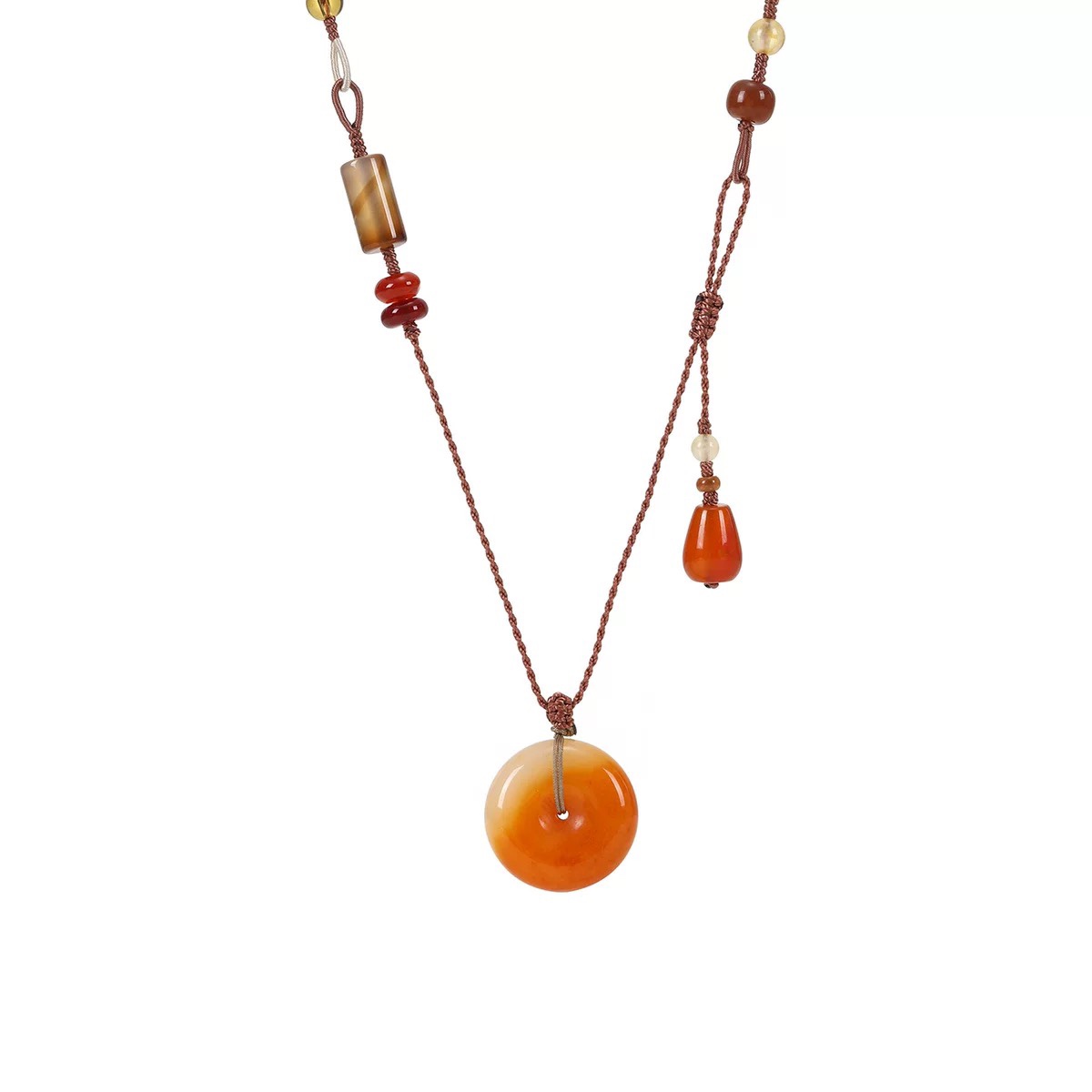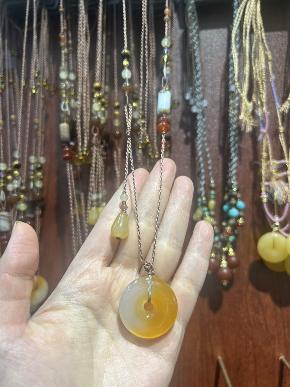 Name: Hand-woven Rope Necklace with Peace Pendant. Size: 25mm Gold thread Jade Peace Pendant, 30mm chalcedony Peace Pendant. Precautions: Natural materials may have minor flaws and imperfections