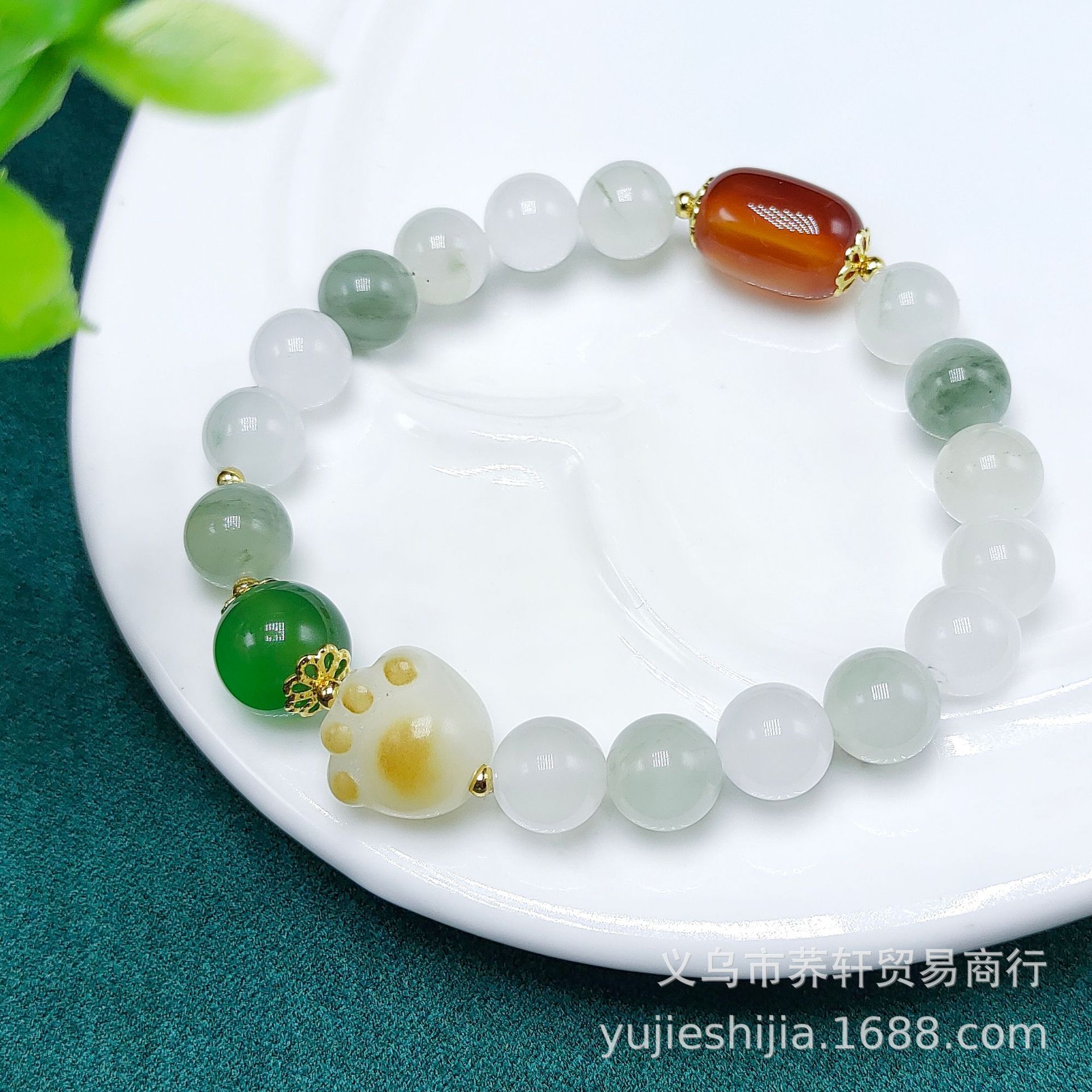 Material: Tianshan jadeite, agate peace pendant with random color, chalcedony lotus pod, agate beads, stone running ring, Bodhi root cat paw cat, copper-plated color-preserving gold beads and pieces