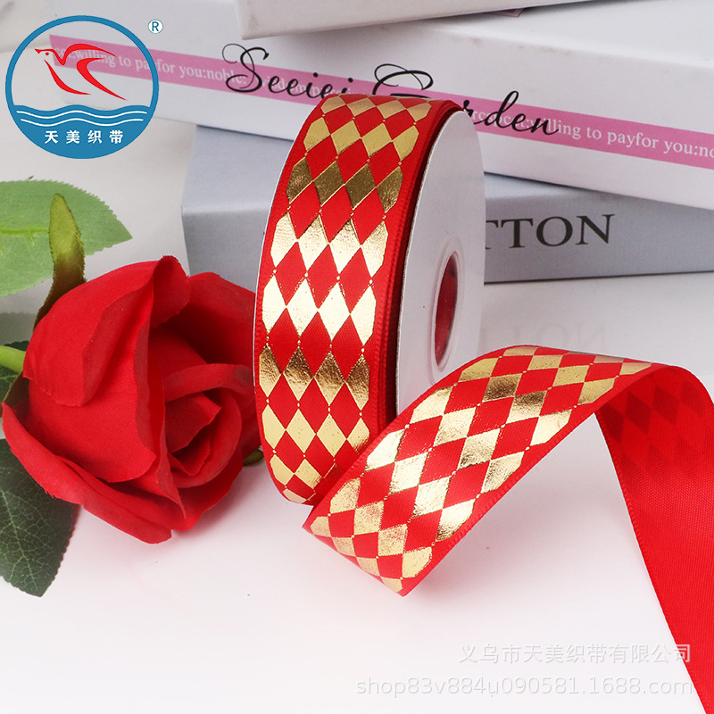 New 2.5CM gold-embossed diamond-shaped ribbon, high-end gift packaging color ribbon, polyester ribbon wholesale, threaded tape, DIY accessories