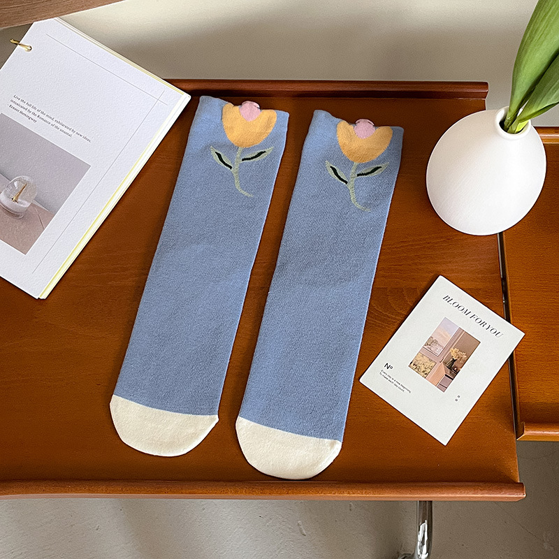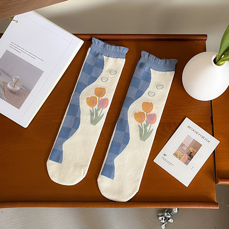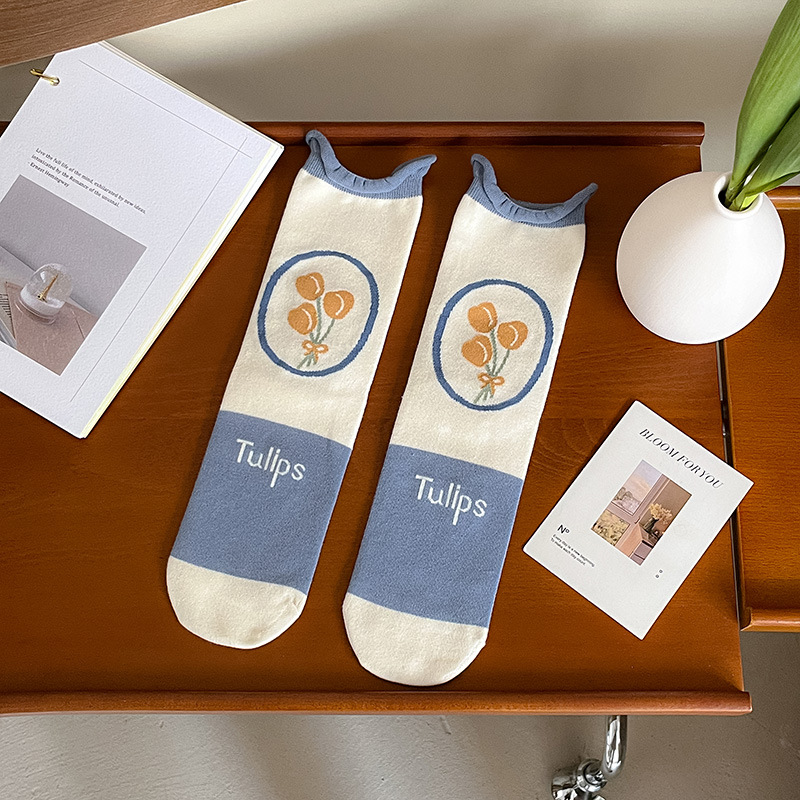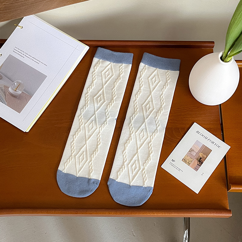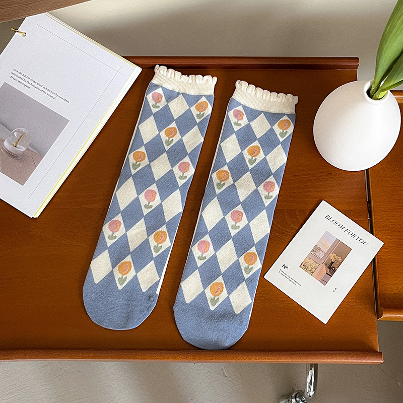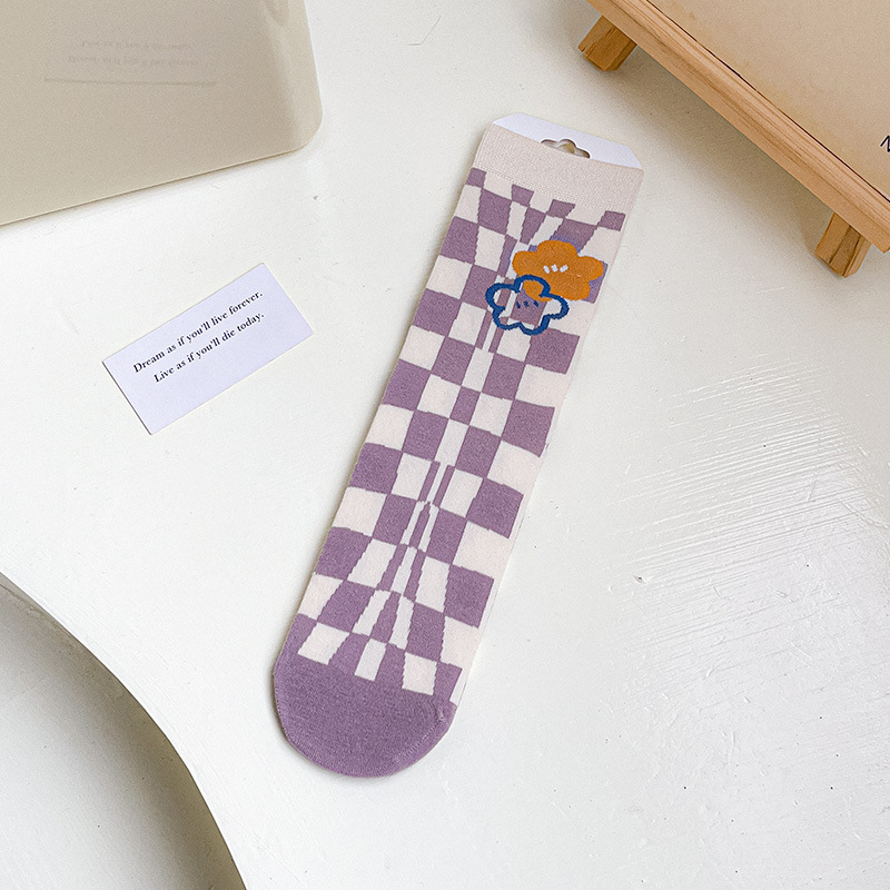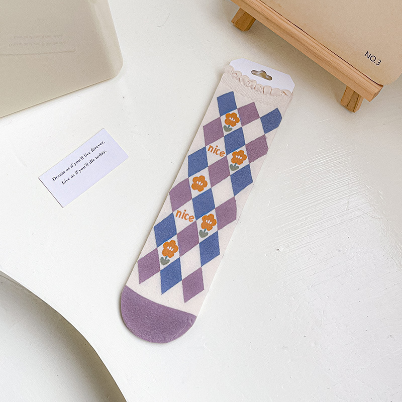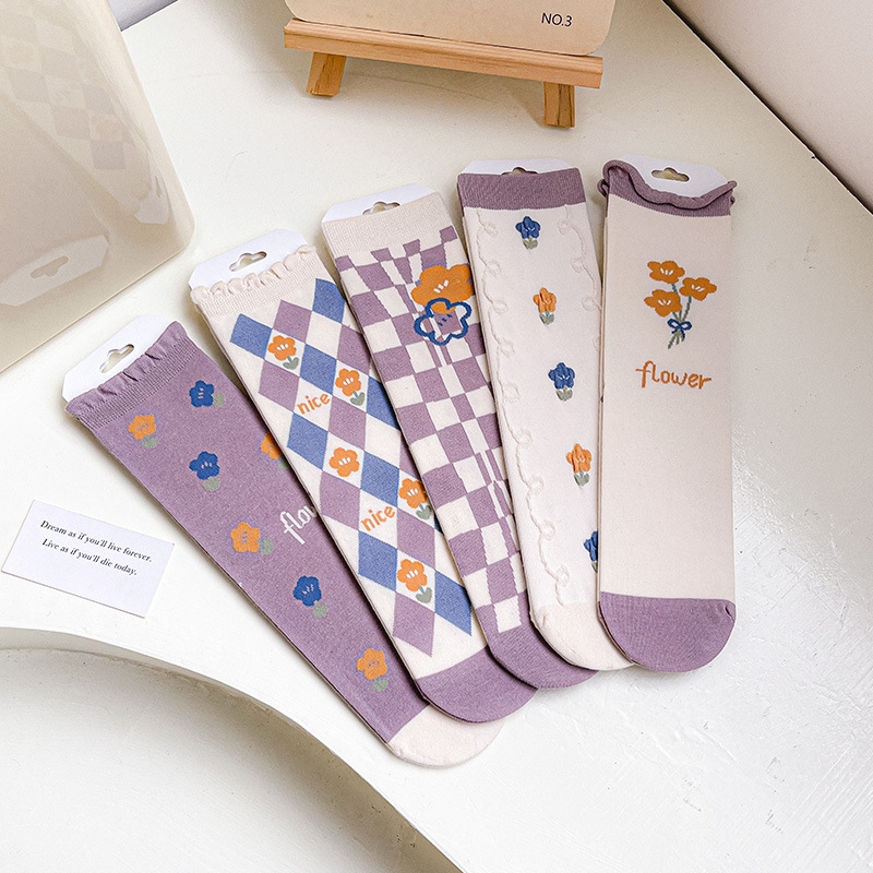 New autumn and winter style taro color straight plate rolled diamond-shaped small flower mid-calf socks for women, fresh cotton socks for women, one-piece consignment